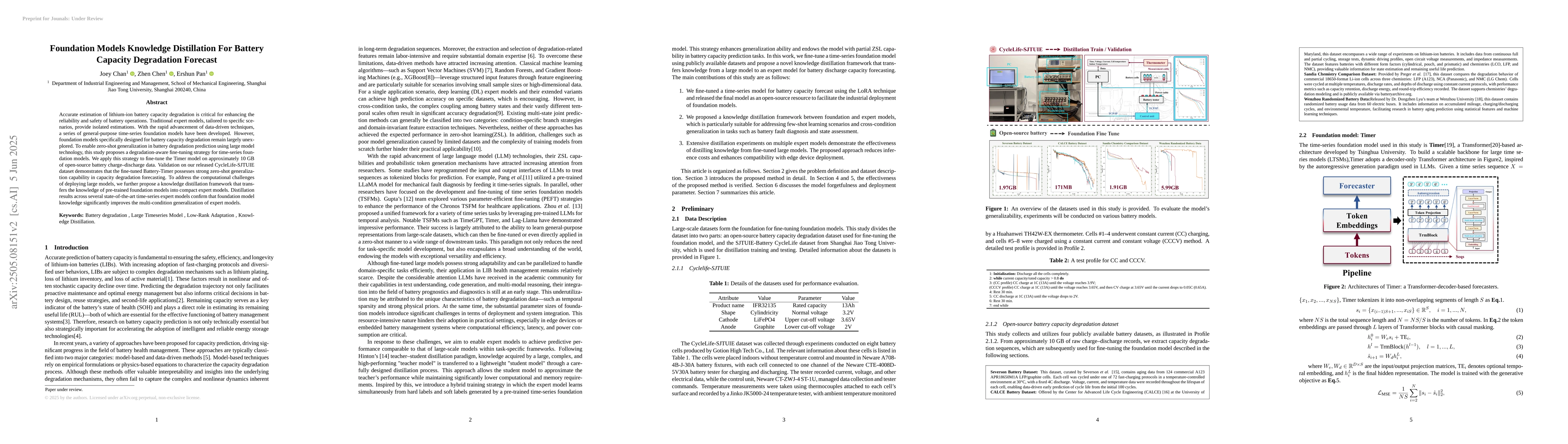 The paper presents a novel knowledge distillation framework for lithium-ion battery capacity degradation modeling, effectively transferring soft knowledge from fine-tuned Battery-Timer to expert models.