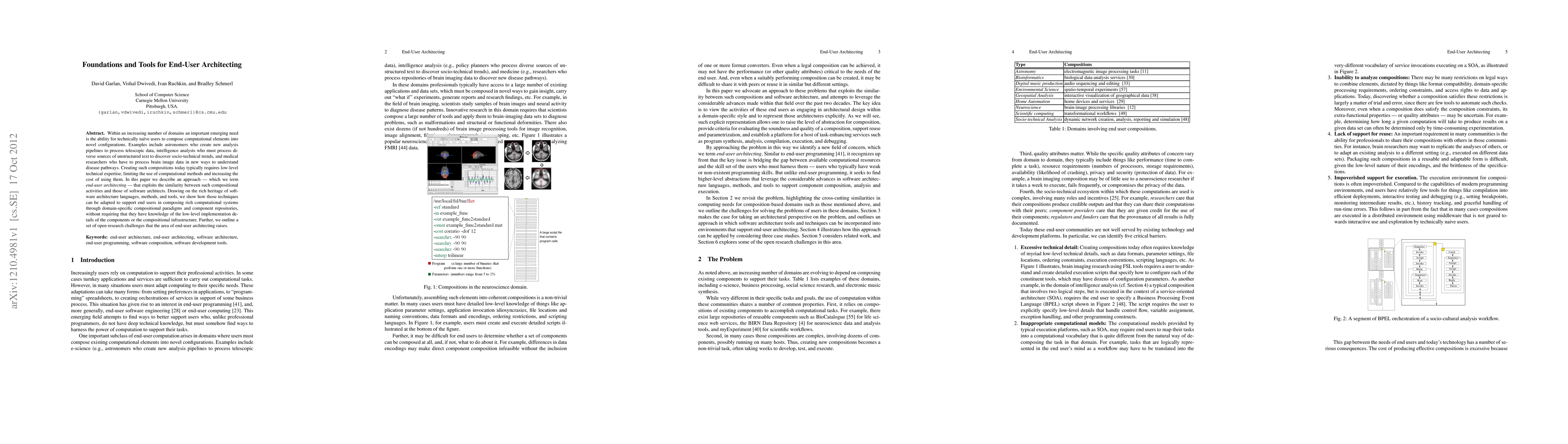 Within an increasing number of domains an important emerging need is the ability for technically naive users to compose computational elements into novel configurations. Examples include astronomers who create new analysis pipelines to process telescopic data, intelligence analysts who must process diverse sources of unstructured text to discover socio-technical trends, and medical researchers who have to process brain image data in new ways to understand disease pathways. Creating such compositions today typically requires low-level technical expertise, limiting the use of computational methods and increasing the cost of using them. In this paper we describe an approach - which we term end-user architecting - that exploits the similarity between such compositional activities and those of software architects. Drawing on the rich heritage of software architecture languages, methods, and tools, we show how those techniques can be adapted to support end users in composing rich computational systems through domain-specific compositional paradigms and component repositories, without requiring that they have knowledge of the low-level implementation details of the components or the compositional infrastructure. Further, we outline a set of open research challenges that the area of end-user architecting raises.