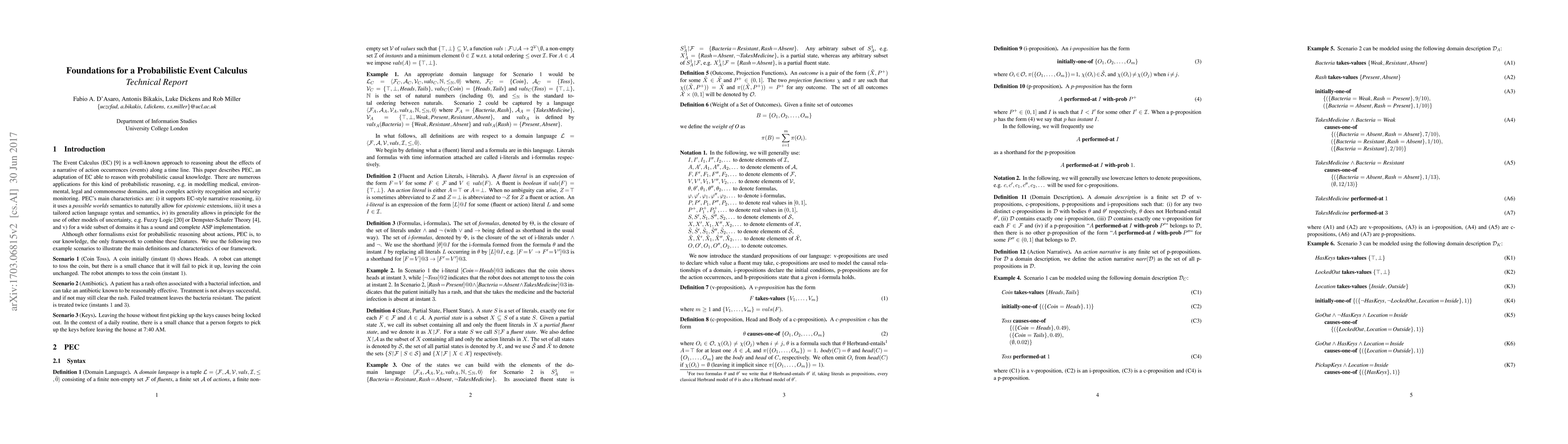 The paper introduces PEC, a probabilistic Event Calculus for reasoning about causal and narrative information, with syntax akin to Modular-E and semantics based on possible worlds. It also presents an ASP implementation demonstrating its soundness and completeness.