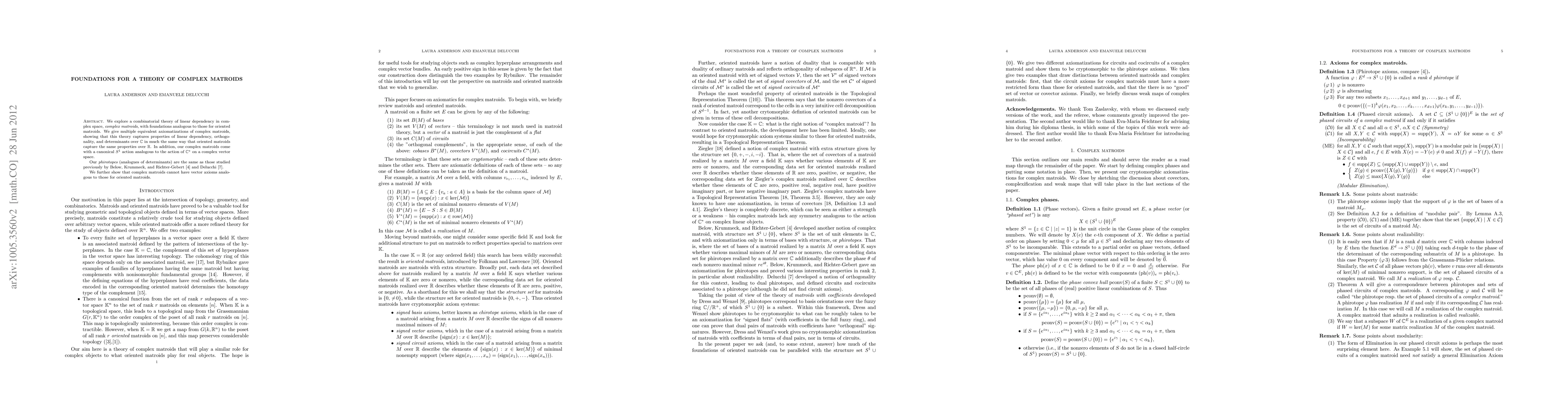 This paper develops a combinatorial theory of "complex matroids" analogous to oriented matroids, providing multiple axiomatizations that capture linear dependency, orthogonality, and determinants over complex numbers. It also introduces a canonical circle action and discusses the limitations of vector axioms.