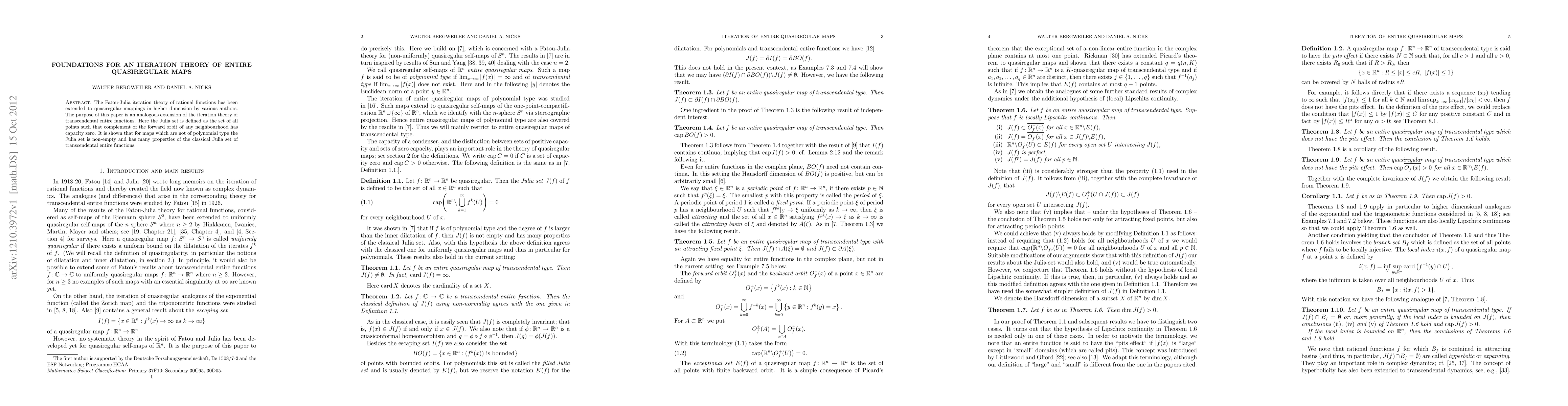 The Fatou-Julia iteration theory of rational functions has been extended to quasiregular mappings in higher dimension by various authors. The purpose of this paper is an analogous extension of the iteration theory of transcendental entire functions. Here the Julia set is defined as the set of all points such that complement of the forward orbit of any neighbourhood has capacity zero. It is shown that for maps which are not of polynomial type the Julia set is non-empty and has many properties of the classical Julia set of transcendental entire functions.