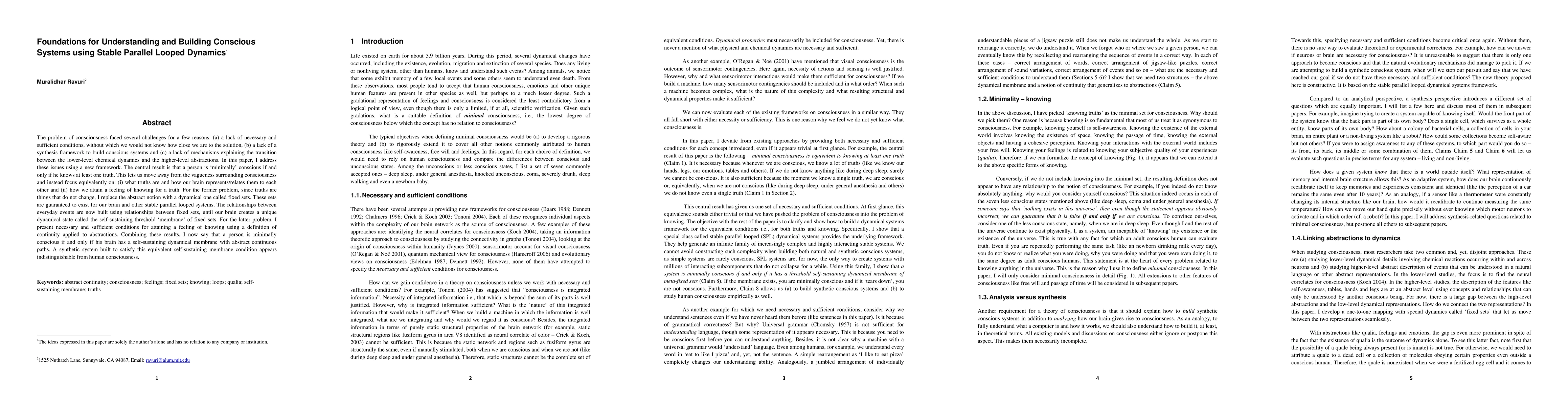 The problem of consciousness faced several challenges for a few reasons: (a) a lack of necessary and sufficient conditions, without which we would not know how close we are to the solution, (b) a lack of a synthesis framework to build conscious systems and (c) a lack of mechanisms explaining the transition between the lower-level chemical dynamics and the higher-level abstractions. In this paper, I address these issues using a new framework. The central result is that a person is 'minimally' conscious if and only if he knows at least one truth. This lets us move away from the vagueness surrounding consciousness and instead focus equivalently on: (i) what truths are and how our brain represents/relates them to each other and (ii) how we attain a feeling of knowing for a truth. For the former problem, since truths are things that do not change, I replace the abstract notion with a dynamical one called fixed sets. These sets are guaranteed to exist for our brain and other stable parallel looped systems. The relationships between everyday events are now built using relationships between fixed sets, until our brain creates a unique dynamical state called the self-sustaining threshold 'membrane' of fixed sets. For the latter problem, I present necessary and sufficient conditions for attaining a feeling of knowing using a definition of continuity applied to abstractions. Combining these results, I now say that a person is minimally conscious if and only if his brain has a self-sustaining dynamical membrane with abstract continuous paths. A synthetic system built to satisfy this equivalent self-sustaining membrane condition appears indistinguishable from human consciousness.