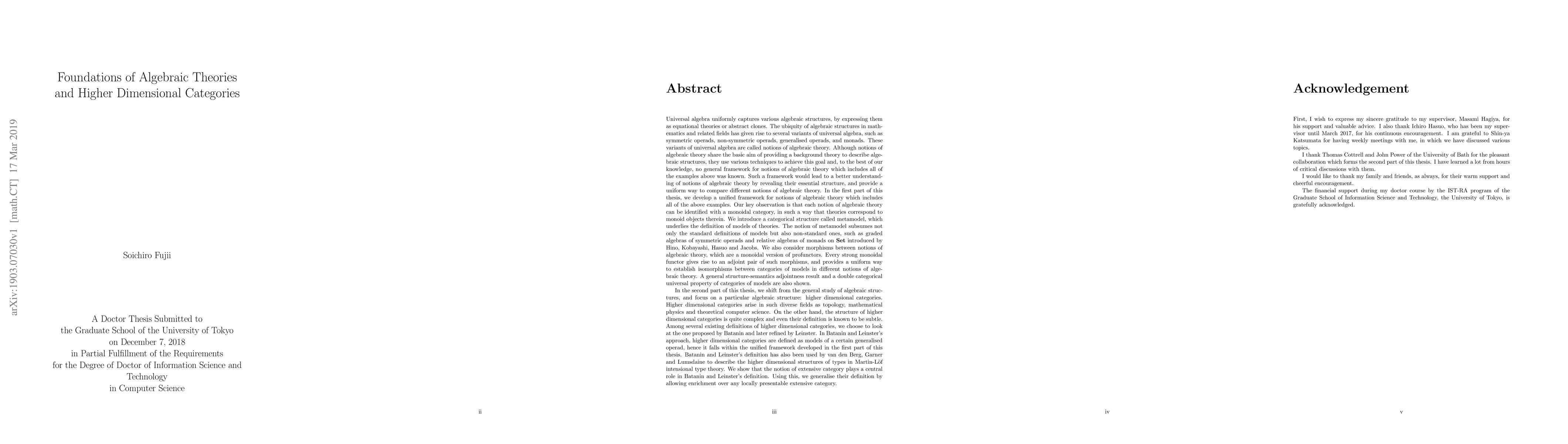 This research paper develops a unified framework for various algebraic theories, identifying them with monoidal categories, and introduces a categorical structure called metamodel for defining models of these theories. It also explores higher-dimensional categories, generalizing the Batanin-Leinster definition by allowing enrichment over any locally presentable extensive category.