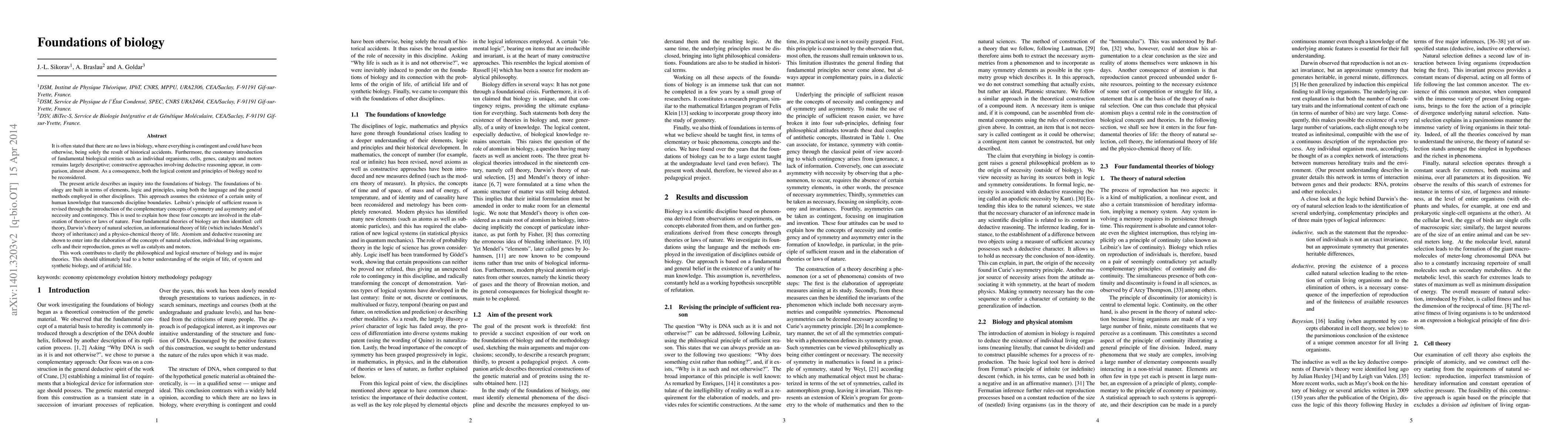 It is often stated that there are no laws in biology, where everything is contingent and could have been otherwise, being solely the result of historical accidents. Furthermore, the customary introduction of fundamental biological entities such as individual organisms, cells, genes, catalysts and motors remains largely descriptive; constructive approaches involving deductive reasoning appear, in comparison, almost absent. As a consequence, both the logical content and principles of biology need to be reconsidered. The present article describes an inquiry into the foundations of biology. The foundations of biology are built in terms of elements, logic and principles, using both the language and the general methods employed in other disciplines. This approach assumes the existence of a certain unity of human knowledge that transcends discipline boundaries. Leibniz's principle of sufficient reason is revised through the introduction of the complementary concepts of symmetry and asymmetry and of necessity and contingency. This is used to explain how these four concepts are involved in the elaboration of theories or laws of nature. Four fundamental theories of biology are then identified: cell theory, Darwin's theory of natural selection, an informational theory of life (which includes Mendel's theory of inheritance) and a physico-chemical theory of life. Atomism and deductive reasoning are shown to enter into the elaboration of the concepts of natural selection, individual living organisms, cells and their reproduction, genes as well as catalysts and motors. This work contributes to clarify the philosophical and logical structure of biology and its major theories. This should ultimately lead to a better understanding of the origin of life, of system and synthetic biology, and of artificial life.