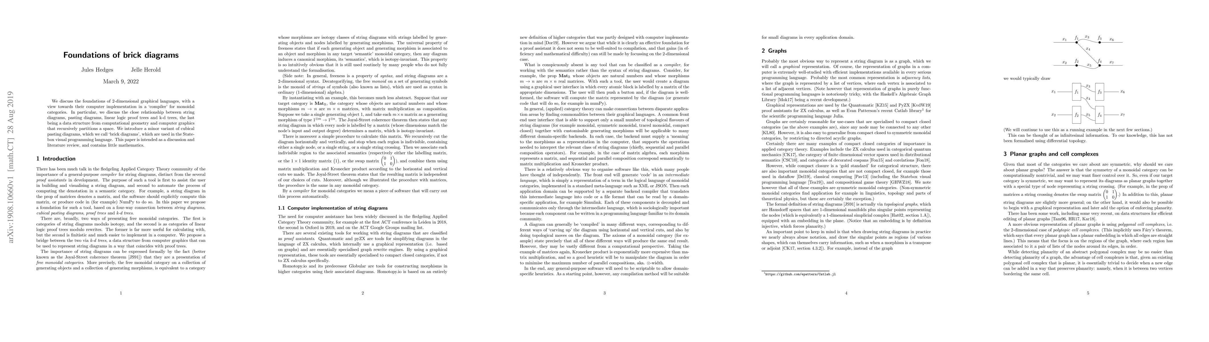 This paper discusses foundations of graphical languages, including string diagrams, pasting diagrams, and a new concept called brick diagrams, which are used in visual programming languages like Statebox.