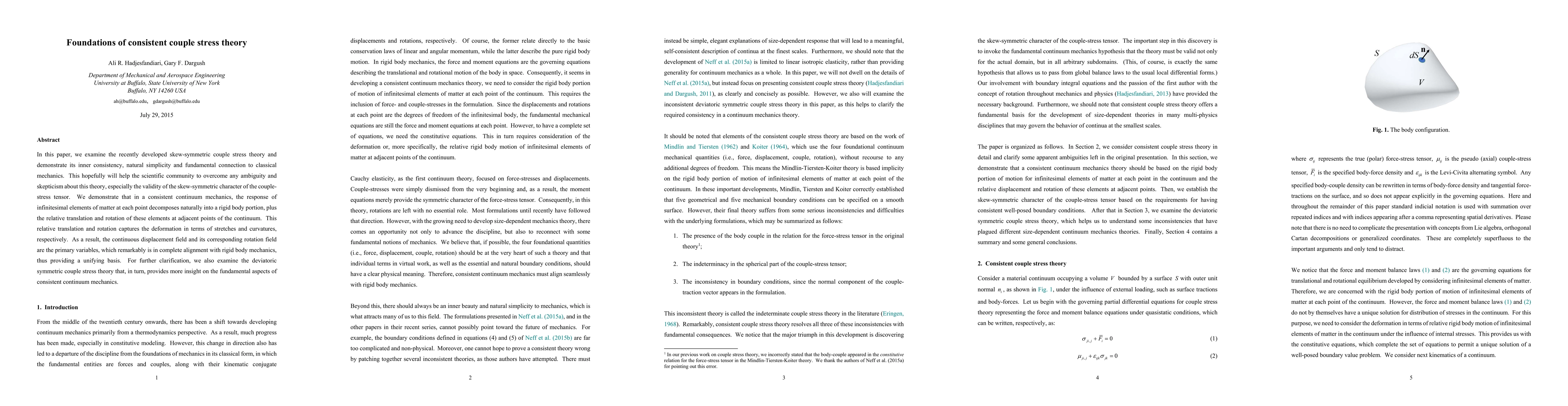 In this paper, we examine the recently developed skew-symmetric couple stress theory and demonstrate its inner consistency, natural simplicity and fundamental connection to classical mechanics. This hopefully will help the scientific community to overcome any ambiguity and skepticism about this theory, especially the validity of the skew-symmetric character of the couple-stress tensor. We demonstrate that in a consistent continuum mechanics, the response of infinitesimal elements of matter at each point decomposes naturally into a rigid body portion, plus the relative translation and rotation of these elements at adjacent points of the continuum. This relative translation and rotation captures the deformation in terms of stretches and curvatures, respectively. As a result, the continuous displacement field and its corresponding rotation field are the primary variables, which remarkably is in complete alignment with rigid body mechanics, thus providing a unifying basis. For further clarification, we also examine the deviatoric symmetric couple stress theory that, in turn, provides more insight on the fundamental aspects of consistent continuum mechanics.