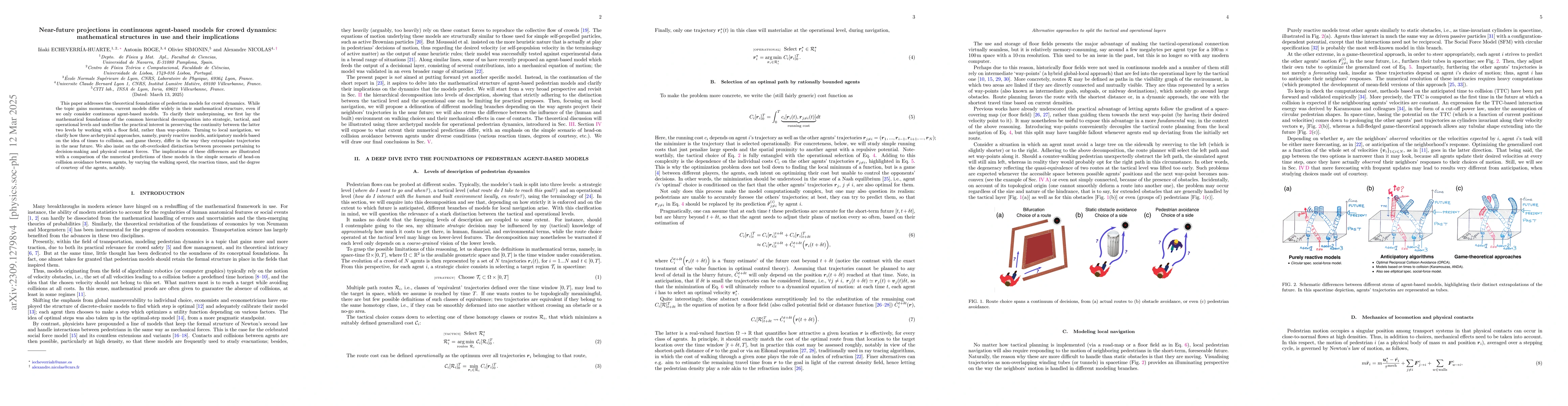 This paper addresses the theoretical foundations of pedestrian models for crowd dynamics. While the topic gains momentum, widely different mathematical approaches are actually in use, even if we only consider continuous agent-based models. To clarify their underpinning, we first rephrase the common hierarchical decomposition into strategic, tactical, and operational levels and show the practical interest in preserving the continuity between the latter two levels by working with a floor field, rather than way-points. Turning to local navigation, we clarify how three archetypical approaches, namely, reactive models, anticipatory models based on the idea of times to collision (exemplified by the recently proposed ANDA model), and game theory, differ in their extrapolation of future trajectories, and insist on the oft-overlooked distinction between processes pertaining to decision-making and mechanical effects in dense settings. The differences are illustrated with a comparison of the numerical predictions of instances of these models in the simple scenario of head-on collision avoidance between agents, by varying the walking speed and the reaction times, notably.