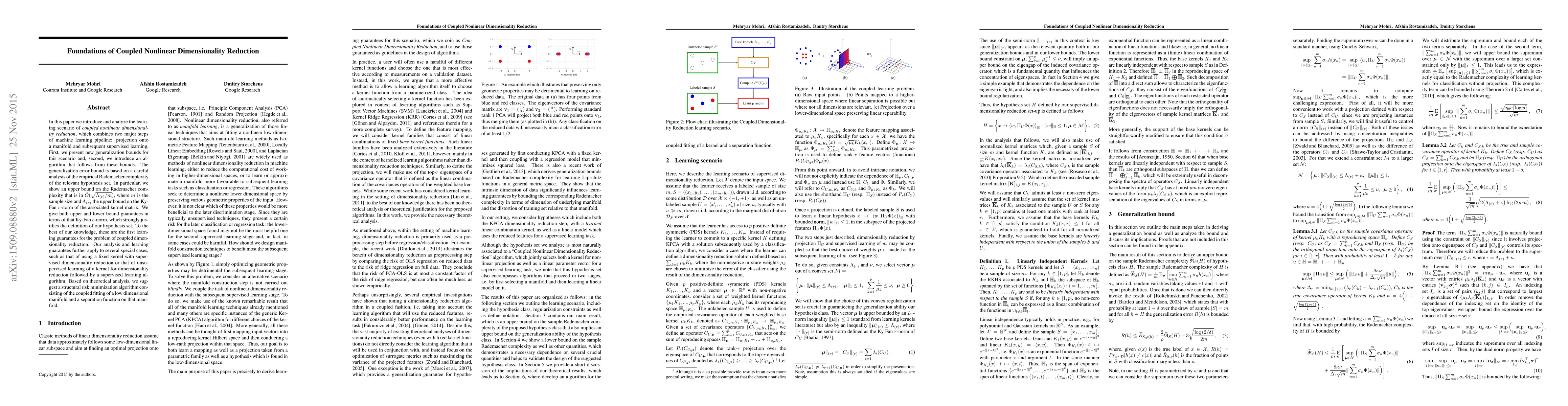 In this paper we introduce and analyze the learning scenario of \emph{coupled nonlinear dimensionality reduction}, which combines two major steps of machine learning pipeline: projection onto a manifold and subsequent supervised learning. First, we present new generalization bounds for this scenario and, second, we introduce an algorithm that follows from these bounds. The generalization error bound is based on a careful analysis of the empirical Rademacher complexity of the relevant hypothesis set. In particular, we show an upper bound on the Rademacher complexity that is in $\widetilde O(\sqrt{\Lambda_{(r)}/m})$, where $m$ is the sample size and $\Lambda_{(r)}$ the upper bound on the Ky-Fan $r$-norm of the associated kernel matrix. We give both upper and lower bound guarantees in terms of that Ky-Fan $r$-norm, which strongly justifies the definition of our hypothesis set. To the best of our knowledge, these are the first learning guarantees for the problem of coupled dimensionality reduction. Our analysis and learning guarantees further apply to several special cases, such as that of using a fixed kernel with supervised dimensionality reduction or that of unsupervised learning of a kernel for dimensionality reduction followed by a supervised learning algorithm. Based on theoretical analysis, we suggest a structural risk minimization algorithm consisting of the coupled fitting of a low dimensional manifold and a separation function on that manifold.