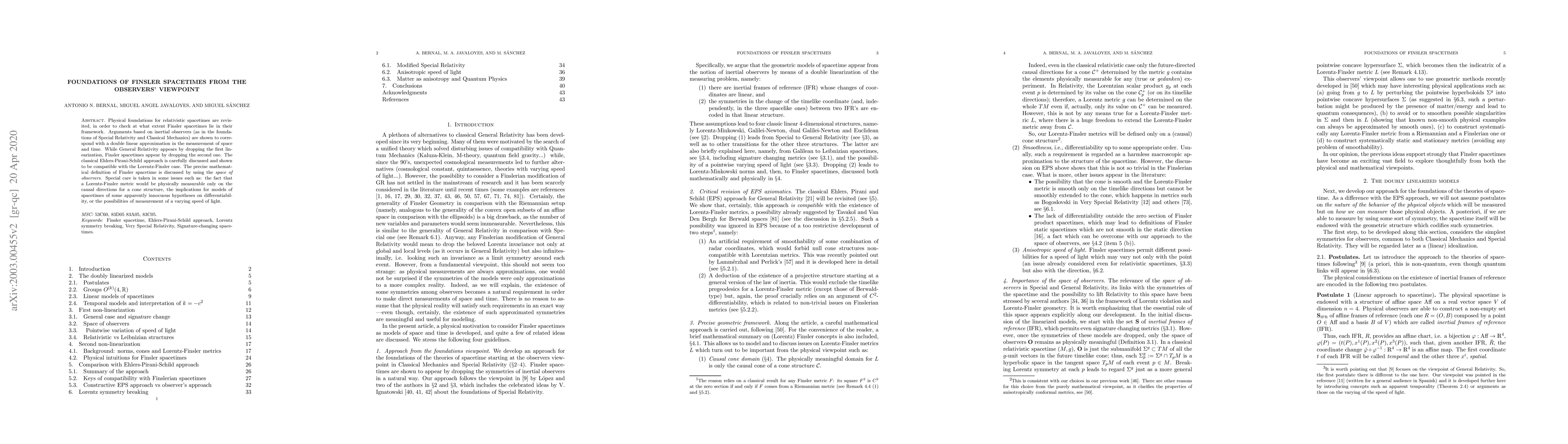 The research revisits physical foundations of relativistic spacetimes, comparing Special Relativity, Classical Mechanics, General Relativity, and Finsler spacetimes through the lens of inertial observers and the space of observers.