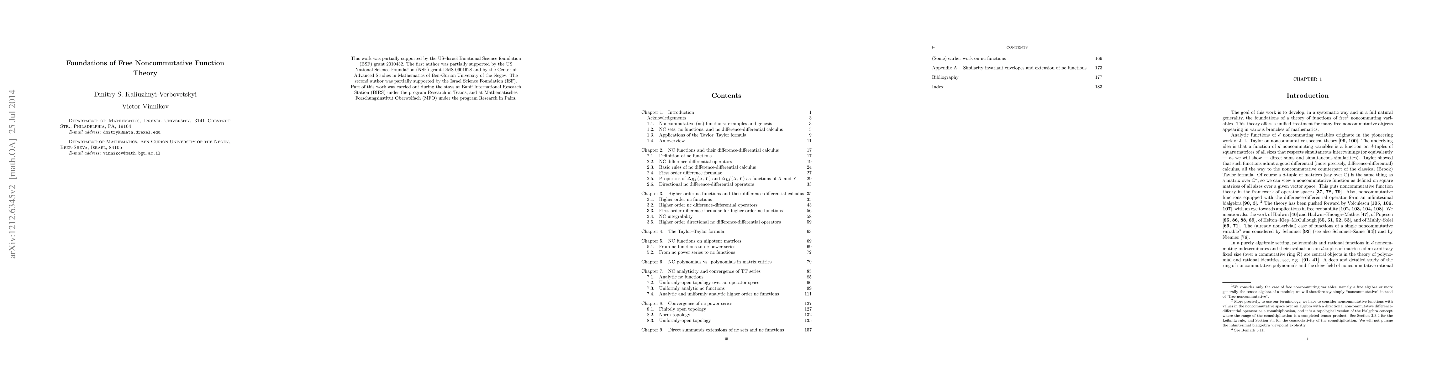 The goal of this work is to develop, in a systematic way and in a full natural generality, the foundations of a theory of functions of (free) noncommuting variables.