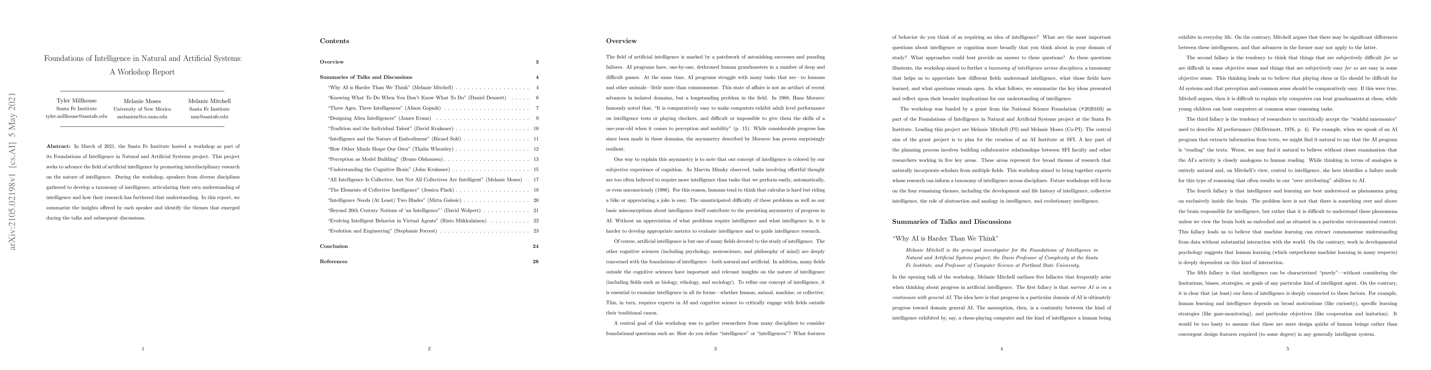 The Santa Fe Institute's 2021 workshop on Foundations of Intelligence explored interdisciplinary perspectives on intelligence in natural and artificial systems, summarizing diverse insights and identifying emerging themes. The report highlights the collective understanding of intelligence and its implications for advancing artificial intelligence research.