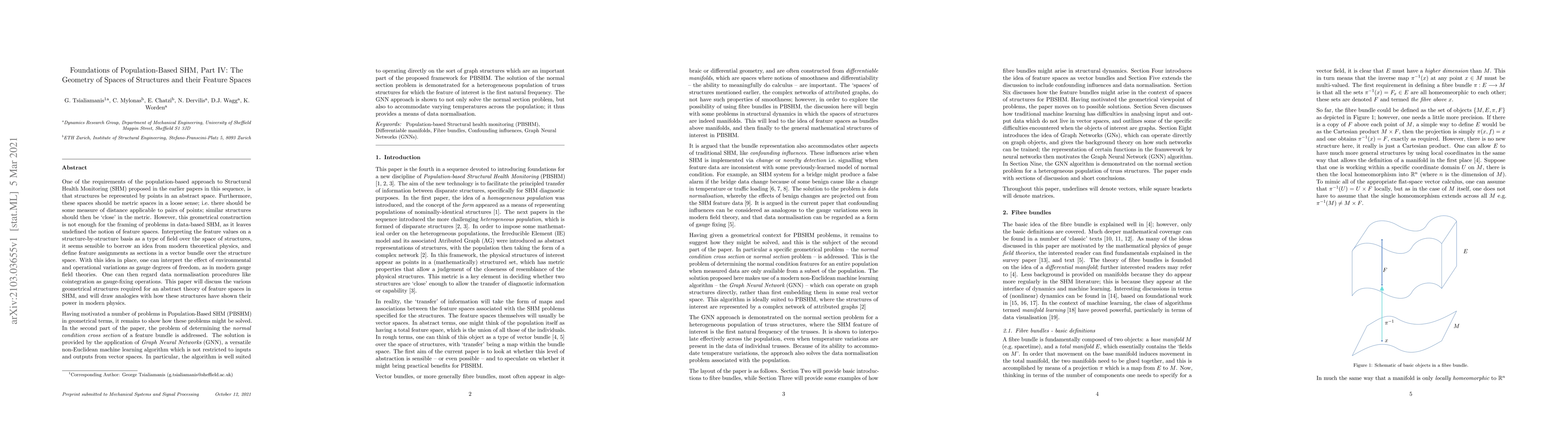 One of the requirements of the population-based approach to Structural Health Monitoring (SHM) proposed in the earlier papers in this sequence, is that structures be represented by points in an abstract space. Furthermore, these spaces should be metric spaces in a loose sense; i.e. there should be some measure of distance applicable to pairs of points; similar structures should then be close in the metric. However, this geometrical construction is not enough for the framing of problems in data-based SHM, as it leaves undefined the notion of feature spaces. Interpreting the feature values on a structure-by-structure basis as a type of field over the space of structures, it seems sensible to borrow an idea from modern theoretical physics, and define feature assignments as sections in a vector bundle over the structure space. With this idea in place, one can interpret the effect of environmental and operational variations as gauge degrees of freedom, as in modern gauge field theories. This paper will discuss the various geometrical structures required for an abstract theory of feature spaces in SHM, and will draw analogies with how these structures have shown their power in modern physics. In the second part of the paper, the problem of determining the normal condition cross section of a feature bundle is addressed. The solution is provided by the application of Graph Neural Networks (GNN), a versatile non-Euclidean machine learning algorithm which is not restricted to inputs and outputs from vector spaces. In particular, the algorithm is well suited to operating directly on the sort of graph structures which are an important part of the proposed framework for PBSHM. The solution of the normal section problem is demonstrated for a heterogeneous population of truss structures for which the feature of interest is the first natural frequency.