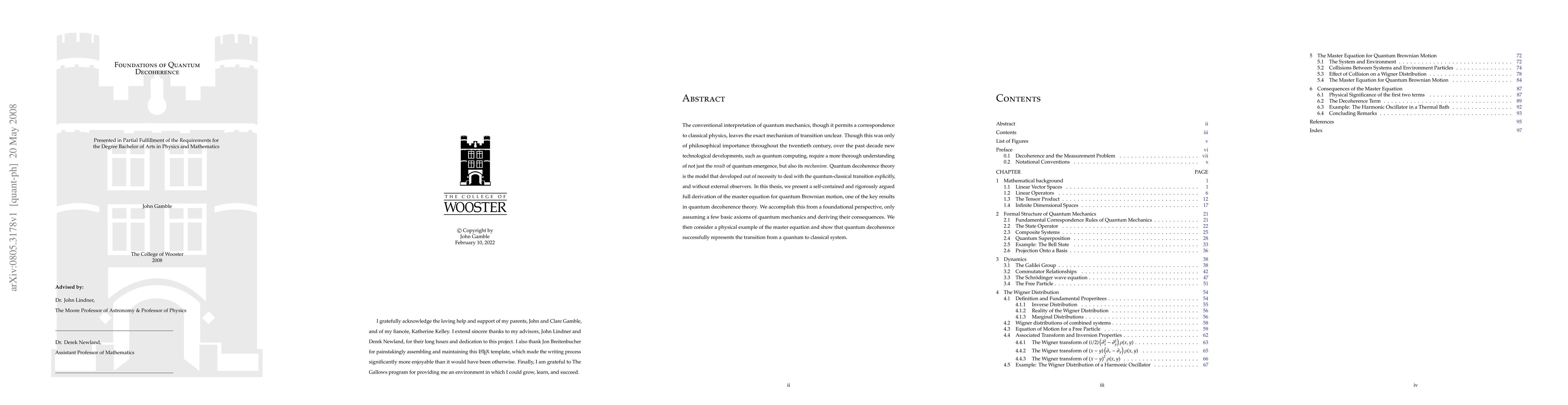 The conventional interpretation of quantum mechanics, though it permits a correspondence to classical physics, leaves the exact mechanism of transition unclear. Though this was only of philosophical importance throughout the twentieth century, over the past decade new technological developments, such as quantum computing, require a more thorough understanding of not just the result of quantum emergence, but also its mechanism. Quantum decoherence theory is the model that developed out of necessity to deal with the quantum-classical transition explicitly, and without external observers. In this thesis, we present a self-contained and rigorously argued full derivation of the master equation for quantum Brownian motion, one of the key results in quantum decoherence theory. We accomplish this from a foundational perspective, only assuming a few basic axioms of quantum mechanics and deriving their consequences. We then consider a physical example of the master equation and show that quantum decoherence successfully represents the transition from a quantum to classical system.