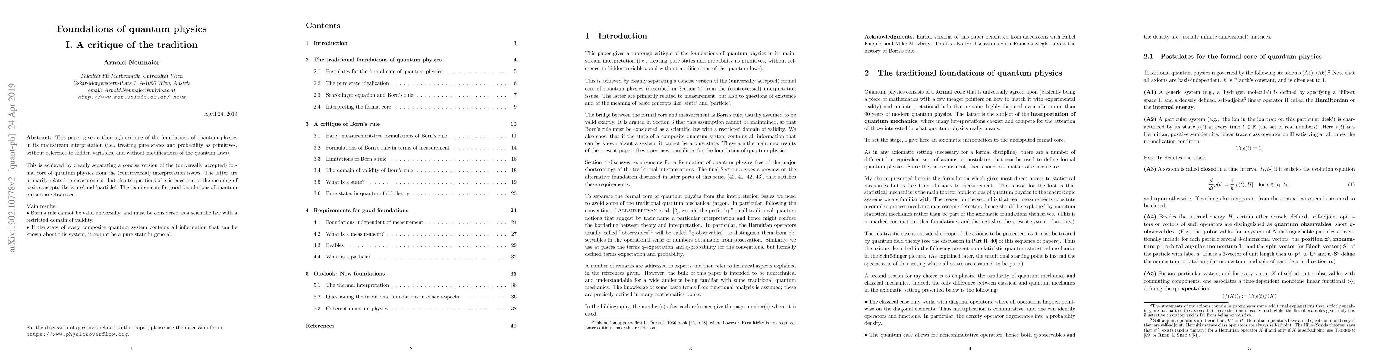 This paper gives a thorough critique of the foundations of quantum physics in its mainstream interpretation (i.e., treating pure states as primitives, without reference to hidden variables, and without modifications of the quantum laws). This is achieved by cleanly separating a concise version of the (universally accepted) formal core of quantum physics from the (controversial) interpretation issues. The latter are primarily related to measurement, but also to questions of existence and of the meaning of basic concepts like 'state' and 'particle'. The requirements for good foundations of quantum physics are discussed. Main results: * Born's rule cannot be valid universally, and must be considered as a scientific law with a restricted domain of validity. * If the state of every composite quantum system contains all information that can be known about this system, it cannot be a pure state in general.