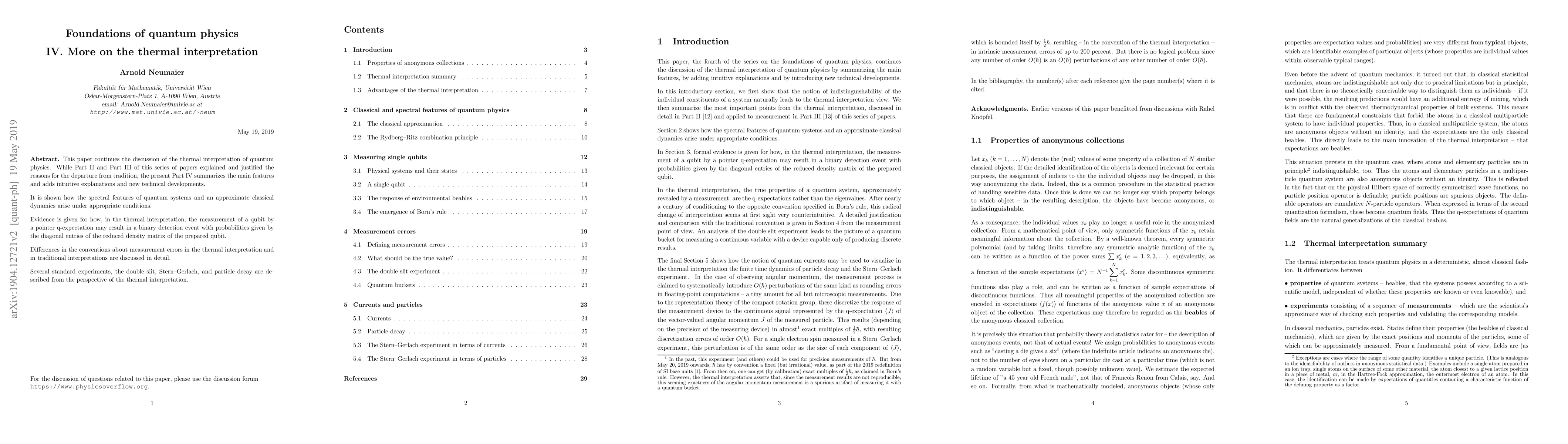 This paper continues the discussion of the thermal interpretation of quantum physics. While Part II and Part III of this series of papers explained and justified the reasons for the departure from tradition, the present Part IV summarizes the main features and adds intuitive explanations and new technical developments. It is shown how the spectral features of quantum systems and an approximate classical dynamics arise under appropriate conditions. Evidence is given for how, in the thermal interpretation, the measurement of a qubit by a pointer q-expectation may result in a binary detection event with probabilities given by the diagonal entries of the reduced density matrix of the prepared qubit. Differences in the conventions about measurement errors in the thermal interpretation and in traditional interpretations are discussed in detail. Several standard experiments, the double slit, Stern--Gerlach, and particle decay are described from the perspective of the thermal interpretation.