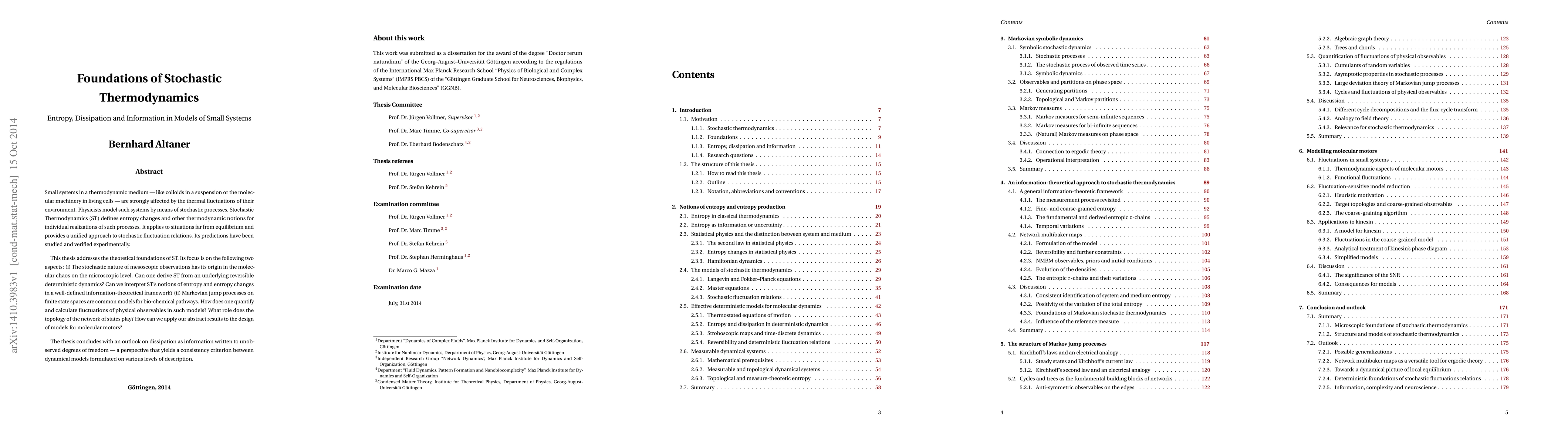 This paper explores the theoretical underpinnings of Stochastic Thermodynamics, focusing on deriving it from reversible deterministic dynamics and interpreting its entropy notions within an information-theoretical framework. It also investigates the quantification of fluctuations in Markovian jump processes, emphasizing the role of network topology in bio-chemical pathways and molecular motors.