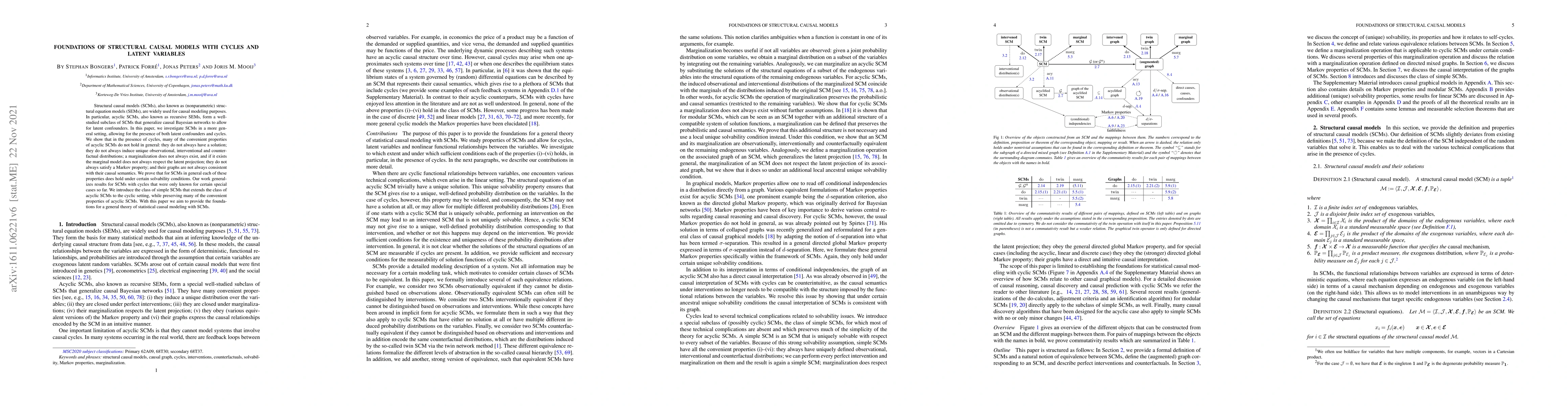 Structural causal models (SCMs), also known as (nonparametric) structural equation models (SEMs), are widely used for causal modeling purposes. In particular, acyclic SCMs, also known as recursive SEMs, form a well-studied subclass of SCMs that generalize causal Bayesian networks to allow for latent confounders. In this paper, we investigate SCMs in a more general setting, allowing for the presence of both latent confounders and cycles. We show that in the presence of cycles, many of the convenient properties of acyclic SCMs do not hold in general: they do not always have a solution; they do not always induce unique observational, interventional and counterfactual distributions; a marginalization does not always exist, and if it exists the marginal model does not always respect the latent projection; they do not always satisfy a Markov property; and their graphs are not always consistent with their causal semantics. We prove that for SCMs in general each of these properties does hold under certain solvability conditions. Our work generalizes results for SCMs with cycles that were only known for certain special cases so far. We introduce the class of simple SCMs that extends the class of acyclic SCMs to the cyclic setting, while preserving many of the convenient properties of acyclic SCMs. With this paper we aim to provide the foundations for a general theory of statistical causal modeling with SCMs.