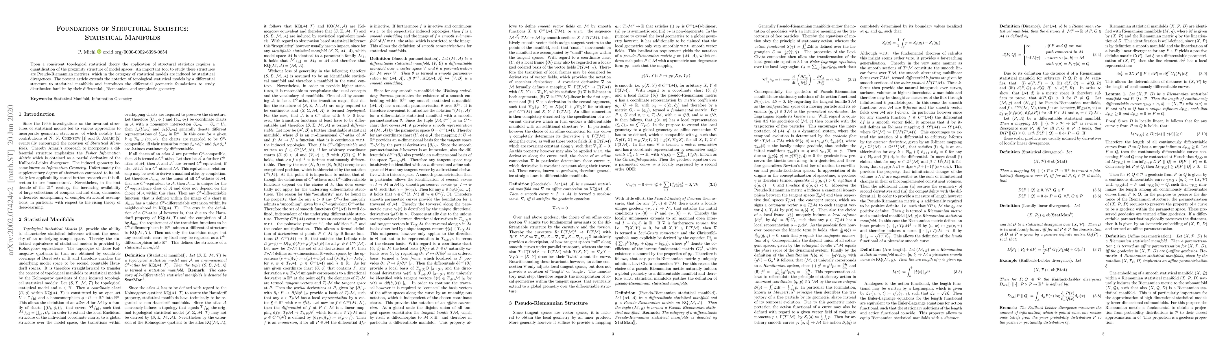 This paper introduces statistical manifolds with differential geometric foundations to study distribution families using pseudo-Riemannian metrics induced by statistical divergences. It establishes a framework for understanding the proximity structure of model spaces in structural statistics.