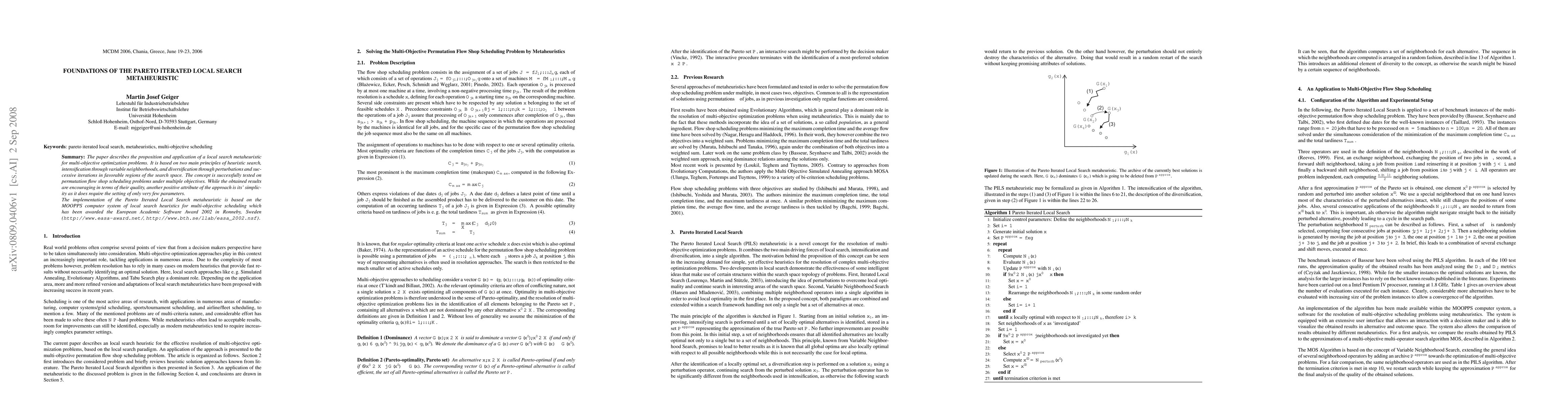 The paper describes the proposition and application of a local search metaheuristic for multi-objective optimization problems. It is based on two main principles of heuristic search, intensification through variable neighborhoods, and diversification through perturbations and successive iterations in favorable regions of the search space. The concept is successfully tested on permutation flow shop scheduling problems under multiple objectives. While the obtained results are encouraging in terms of their quality, another positive attribute of the approach is its' simplicity as it does require the setting of only very few parameters. The implementation of the Pareto Iterated Local Search metaheuristic is based on the MOOPPS computer system of local search heuristics for multi-objective scheduling which has been awarded the European Academic Software Award 2002 in Ronneby, Sweden (http://www.easa-award.net/, http://www.bth.se/llab/easa_2002.nsf)