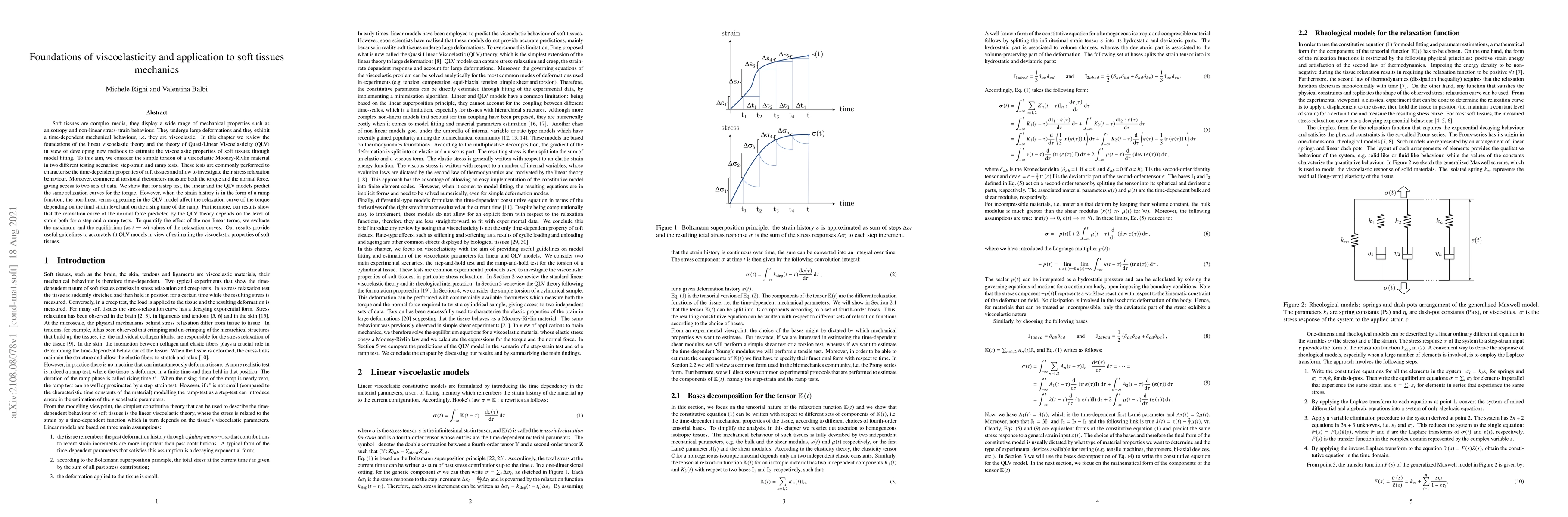 This paper reviews the foundations of linear and Quasi-Linear Viscoelasticity (QLV) theories to develop methods for estimating viscoelastic properties of soft tissues. It demonstrates that while linear and QLV models predict similar relaxation curves for step-strain tests, QLV accounts for non-linear effects that significantly alter relaxation curves under ramp-strain conditions, providing guidelines for model fitting.