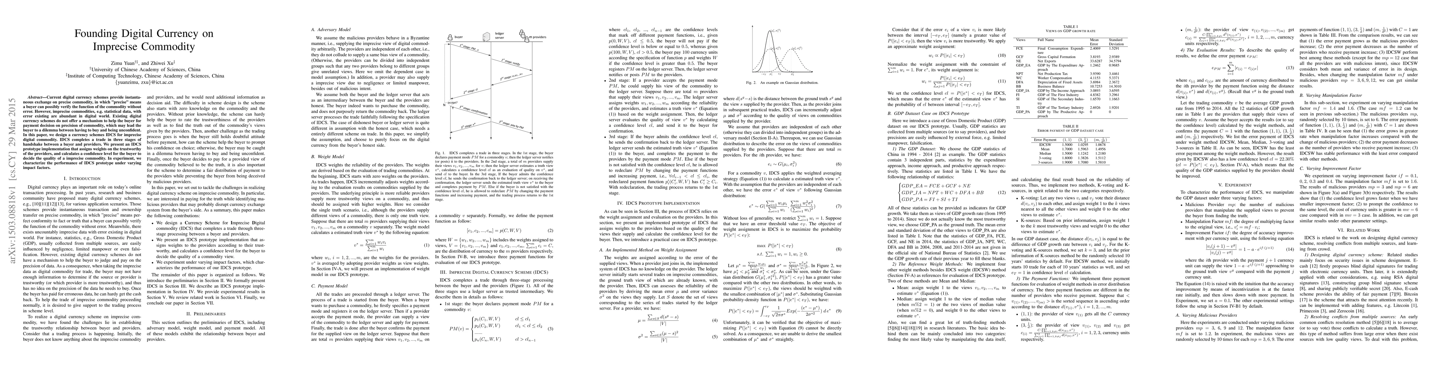 Current digital currency schemes provide instantaneous exchange on precise commodity, in which "precise" means a buyer can possibly verify the function of the commodity without error. However, imprecise commodities, e.g. statistical data, with error existing are abundant in digital world. Existing digital currency schemes do not offer a mechanism to help the buyer for payment decision on precision of commodity, which may lead the buyer to a dilemma between having to buy and being unconfident. In this paper, we design a currency schemes IDCS for imprecise digital commodity. IDCS completes a trade in three stages of handshake between a buyer and providers. We present an IDCS prototype implementation that assigns weights on the trustworthy of the providers, and calculates a confidence level for the buyer to decide the quality of a imprecise commodity. In experiment, we characterize the performance of IDCS prototype under varying impact factors.