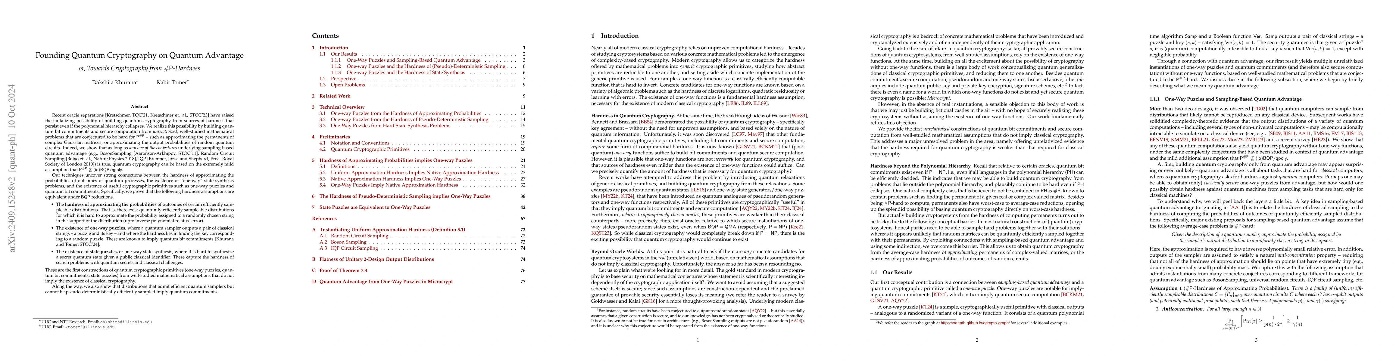 This paper constructs quantum cryptographic primitives—such as quantum bit commitments and secure computation—based on mathematical problems conjectured to be hard for $\mathsf{P^{\#P}}$, like approximating the permanent of Gaussian matrices, without relying on classical cryptography. It proves equivalence between the hardness of sampling from certain distributions, the existence of one-way quantum puzzles, and the difficulty of synthesizing secret quantum states, demonstrating the viability of quantum cryptography under these assumptions.