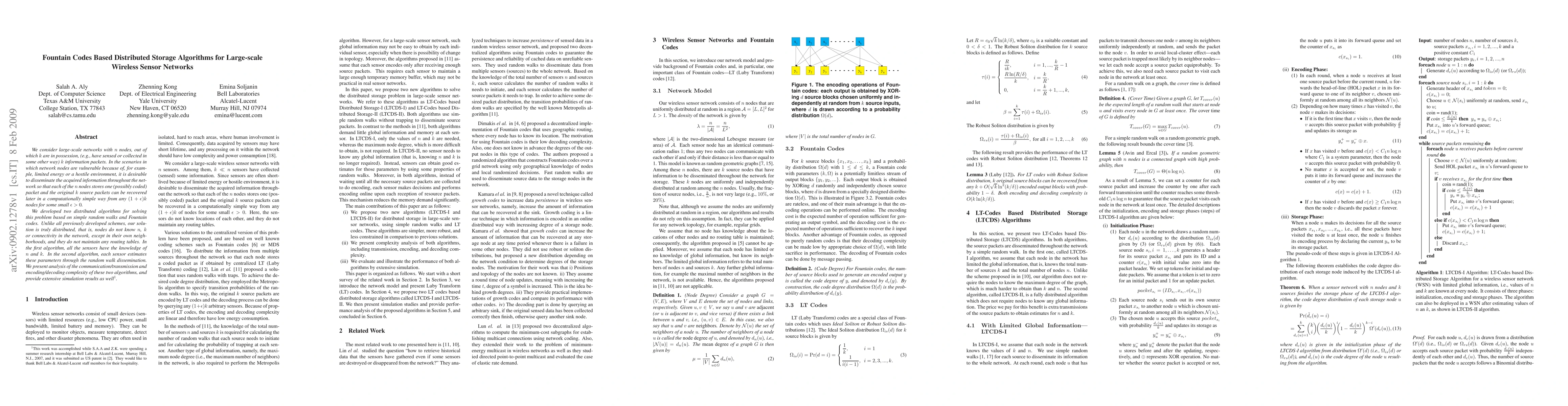 This paper proposes two distributed storage algorithms for large-scale wireless sensor networks using Fountain codes and random walks to disseminate information packets. The algorithms enable recovery of original packets from a subset of nodes, ensuring robustness against node vulnerabilities, with minimal knowledge and no routing tables required.