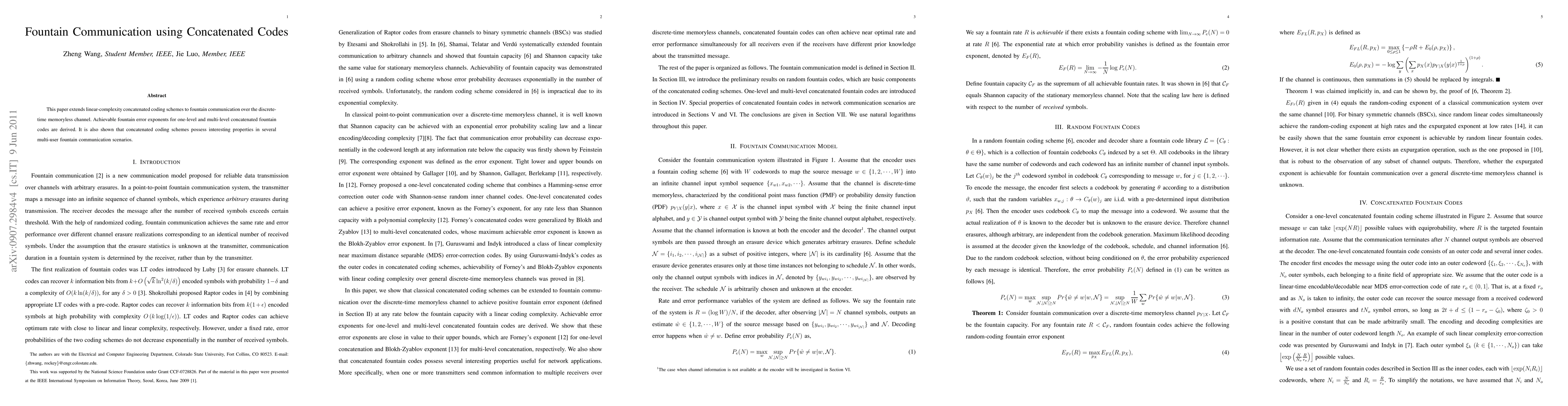 This paper develops linear-complexity concatenated coding schemes for fountain communication over memoryless channels, deriving achievable error exponents for single and multi-level codes, and highlighting their benefits in multi-user scenarios.