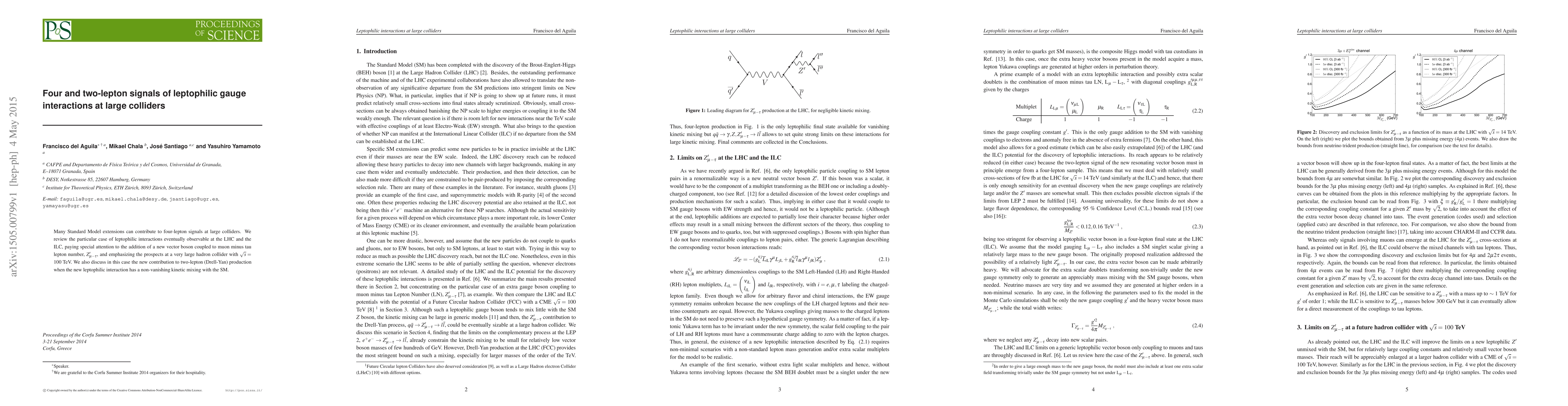 Many Standard Model extensions can contribute to four-lepton signals at large colliders. We review the particular case of leptophilic interactions eventually observable at the LHC and the ILC, paying special attention to the addition of a new vector boson coupled to muon minus tau lepton number, $Z'_{\mu - \tau}$, and emphasizing the prospects at a very large hadron collider with $\sqrt s =$ 100 TeV. We also discuss in this case the new contribution to two-lepton (Drell-Yan) production when the new leptophilic interaction has a non-vanishing kinetic mixing with the SM.
