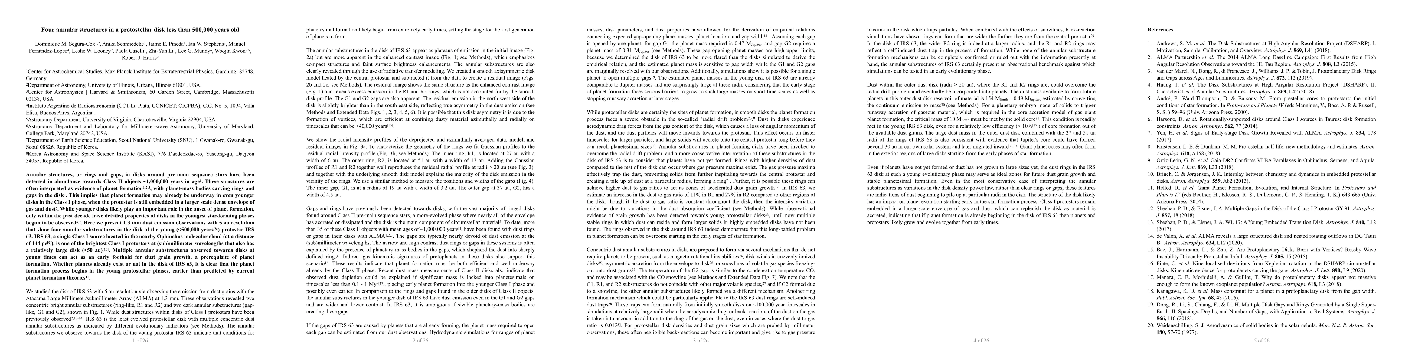 This paper reports the discovery of four annular structures in the protostellar disk of IRS 63, a young (<500,000 years) Class I protostar in the Ophiuchus molecular cloud. These structures suggest that planet formation may begin earlier than previously thought, providing evidence that planet formation processes start in the earliest stages of star formation.