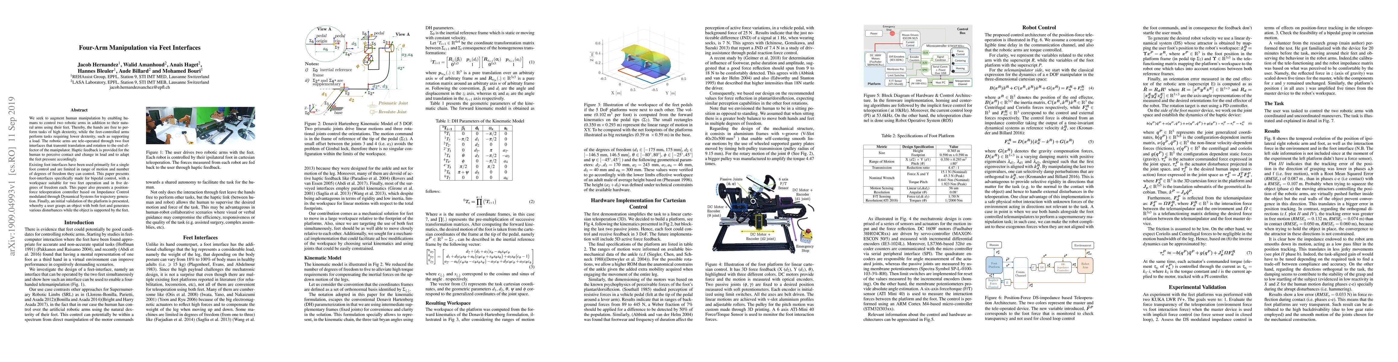 We seek to augment human manipulation by enabling humans to control two robotic arms in addition to their natural arms using their feet. Thereby, the hands are free to perform tasks of high dexterity, while the feet-controlled arms perform tasks requiring lower dexterity, such as supporting a load. The robotic arms are tele-operated through two foot interfaces that transmit translation and rotation to the end effector of the manipulator. Haptic feedback is provided for the human to perceive contact and change in load and to adapt the feet pressure accordingly. Existing foot interfaces have been used primarily for a single foot control and are limited in range of motion and number of degrees of freedom they can control. This paper presents foot-interfaces specifically made for bipedal control, with a workspace suitable for two feet operation and in five degrees of freedom each. This paper also presents a position-force teleoperation controller based on Impedance Control modulated through Dynamical Systems for trajectory generation. Finally, an initial validation of the platform is presented, whereby a user grasps an object with both feet and generates various disturbances while the object is supported by the feet.