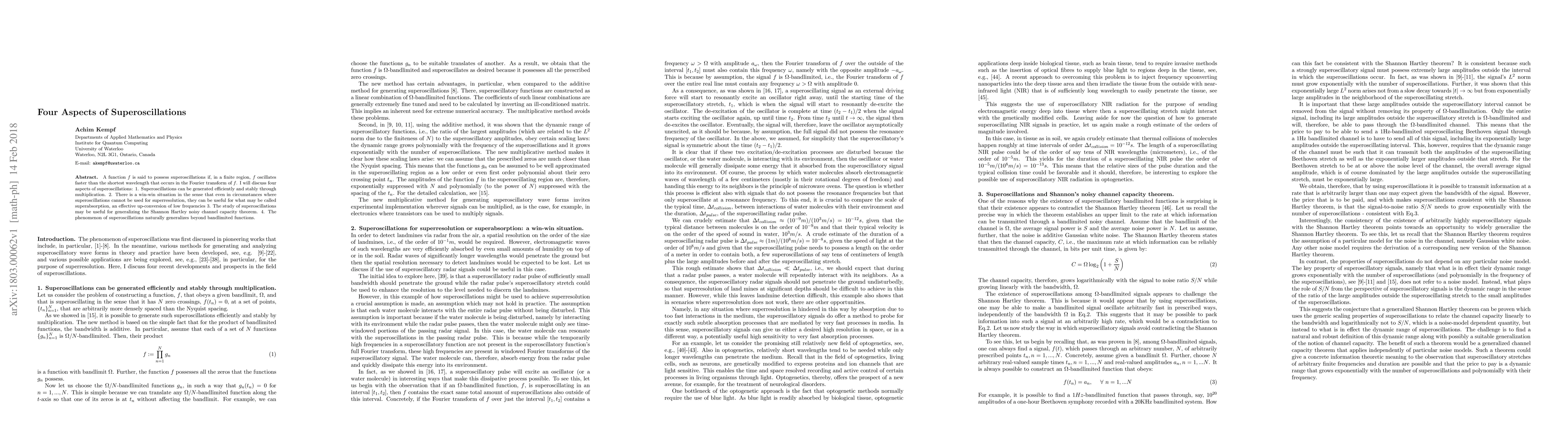 A function f is said to possess superoscillations if, in a finite region, f oscillates faster than the shortest wavelength that occurs in the Fourier transform of f. I will discuss four aspects of superoscillations: 1. Superoscillations can be generated efficiently and stably through multiplication. 2. There is a win-win situation in the sense that even in circumstances where superoscillations cannot be used for superresolution, they can be useful for what may be called superabsorption, an effective up-conversion of low frequencies 3. The study of superoscillations may be useful for generalizing the Shannon Hartley noisy channel capacity theorem. 4. The phenomenon of superoscillations naturally generalizes beyond bandlimited functions.