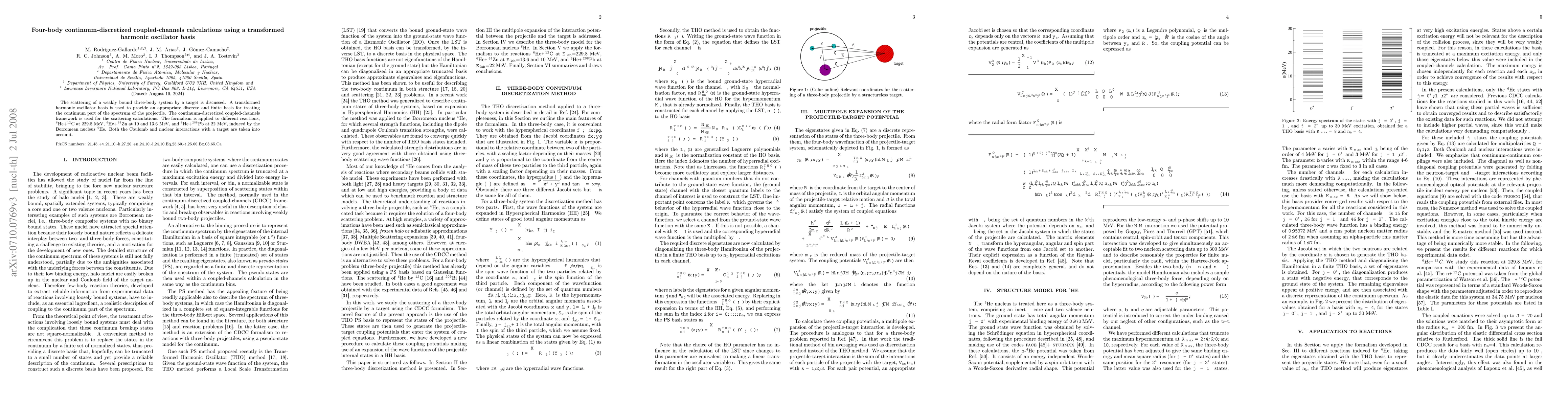 This paper presents four-body continuum-discretized coupled-channels calculations using a transformed harmonic oscillator basis to treat the continuum spectrum of a weakly bound three-body system. The method is applied to reactions involving the Borromean nucleus 6He, considering both Coulomb and nuclear interactions.