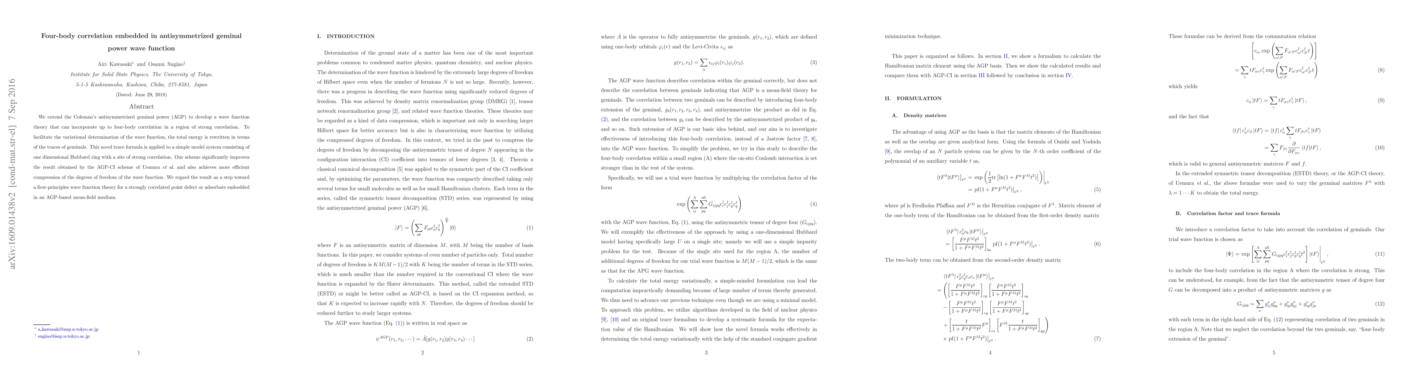 We extend the Coleman's antisymmetrized geminal power (AGP) to develop a wave function theory that can incorporate up to four-body correlation in a region of strong correlation. To facilitate the variational determination of the wave function, the total energy is rewritten in terms of the traces of geminals. This novel trace formula is applied to a simple model system consisting of one dimensional Hubbard ring with a site of strong correlation. Our scheme significantly improves the result obtained by the AGP-CI scheme of Uemura et al. and also achieves more efficient compression of the degrees of freedom of the wave function. We regard the result as a step toward a first-principles wave function theory for a strongly correlated point defect or adsorbate embedded in an AGP-based mean-field medium.