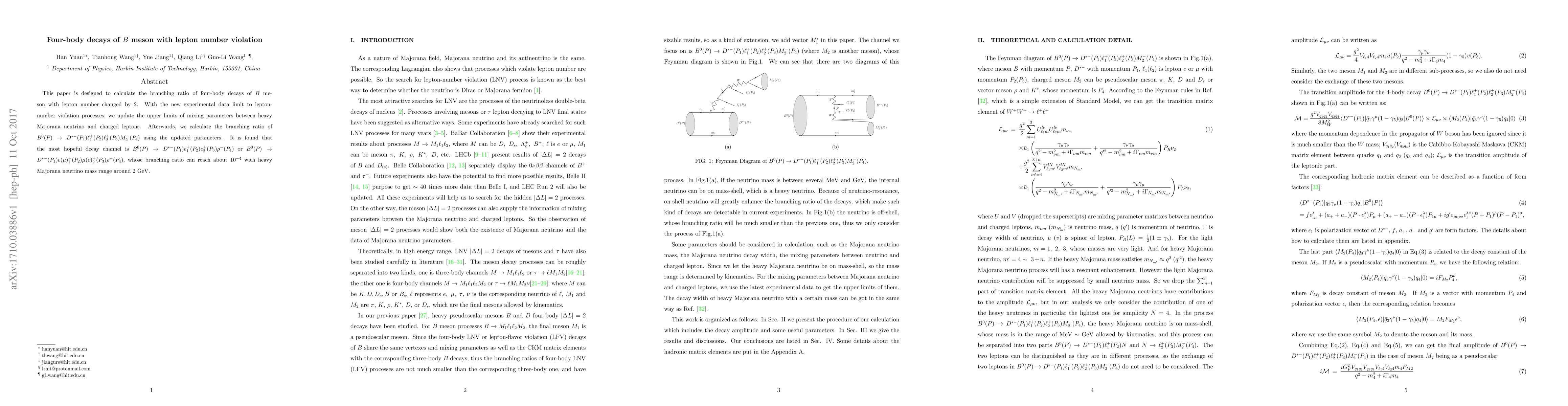 This research is significant as it updates upper limits of mixing parameters between charged leptons and heavy Majorana neutrinos, providing a relationship between Majorana neutrino mass and decay branching ratios. It highlights the potential for detecting specific four-body decays of heavy mesons in current and future experiments, contributing to the exploration of lepton number violation processes.