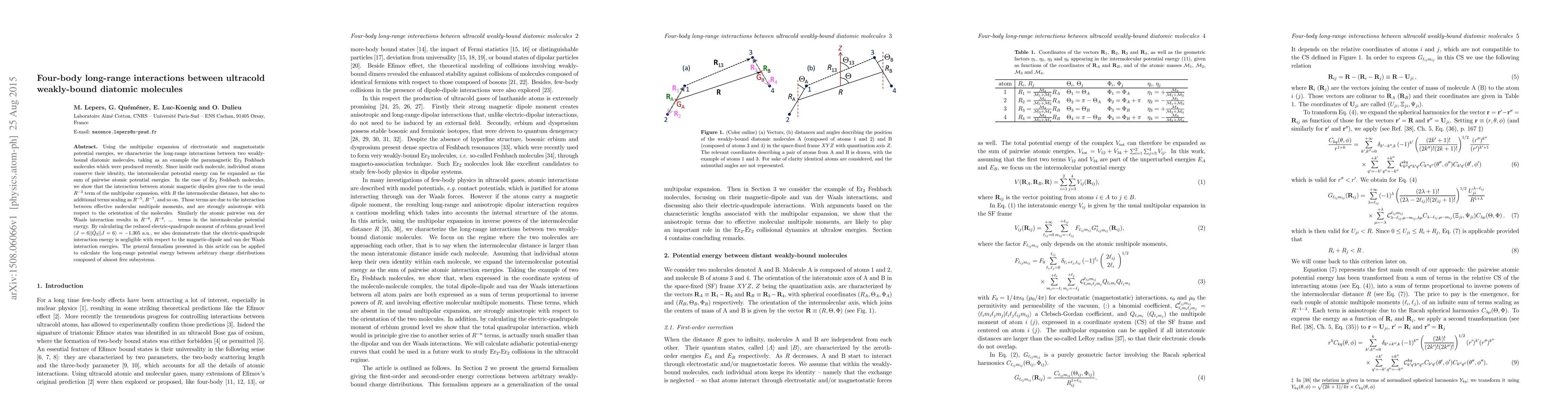 This research characterizes long-range interactions between weakly-bound diatomic molecules using multipolar expansion, focusing on paramagnetic Er$_2$ Feshbach molecules. It reveals significant $R^{-5}$, $R^{-7}$, etc., terms due to molecular multipole interactions, alongside conventional $R^{-3}$ terms, and negligible electric-quadrupole contributions.