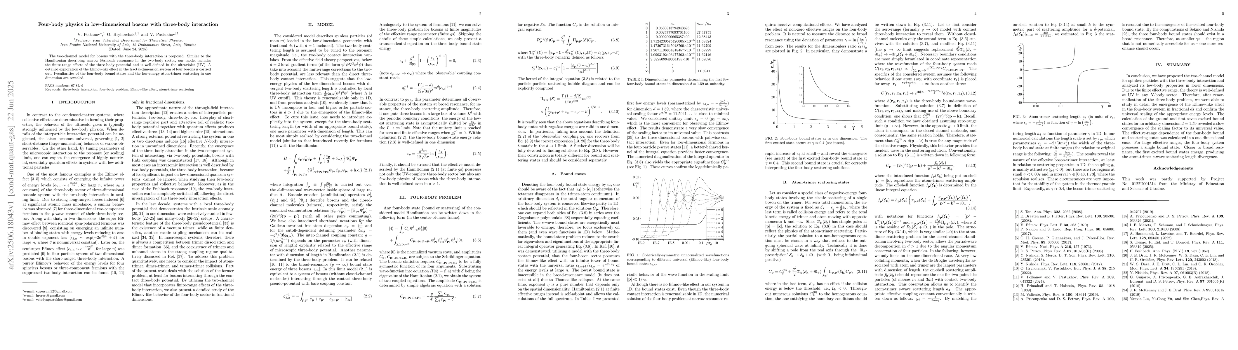 The two-channel model for bosons with the three-body interaction is proposed. Similar to the Hamiltonian describing narrow Feshbach resonance in the two-body sector, our model includes the finite-range effects of the three-body potential and is well-defined in the ultraviolet (UV). A detailed exploration of the Efimov-like effect in the fractal-dimension system of four bosons is carried out. Peculiarities of the four-body bound states and the low-energy atom-trimer scattering in one dimension are revealed.
