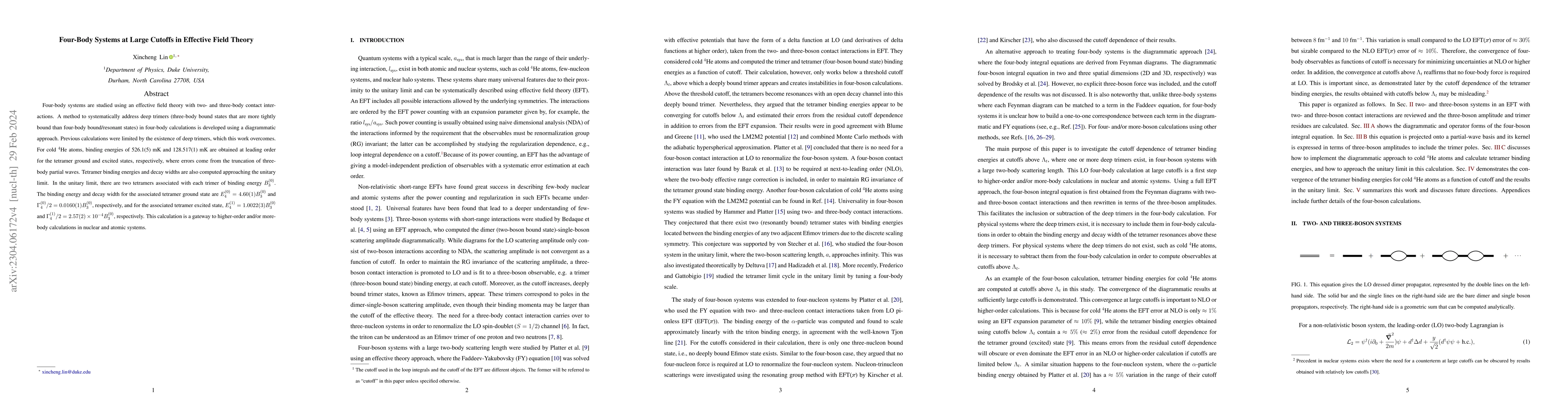 This paper develops an effective field theory approach to study four-body systems, particularly overcoming limitations posed by deep trimers. It provides binding energies for tetramers in cold $^4$He atoms and computes tetramer decay widths near the unitary limit, opening pathways for more complex nuclear and atomic calculations.