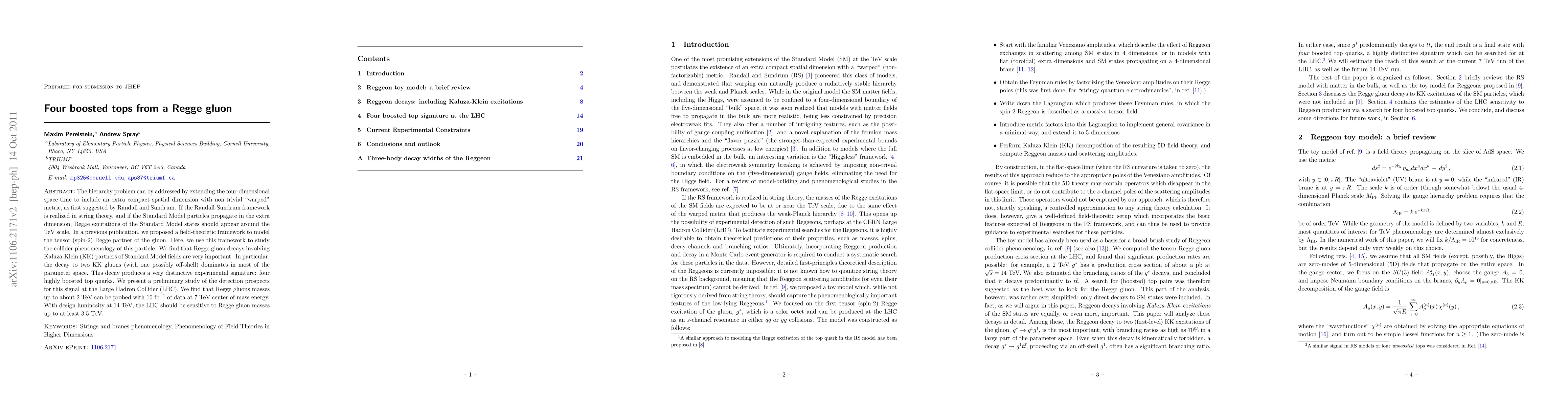 The hierarchy problem can by addressed by extending the four-dimensional space-time to include an extra compact spatial dimension with non-trivial "warped" metric, as first suggested by Randall and Sundrum. If the Randall-Sundrum framework is realized in string theory, and if the Standard Model particles propagate in the extra dimension, Regge excitations of the Standard Model states should appear around the TeV scale. In a previous publication, we proposed a field-theoretic framework to model the tensor (spin-2) Regge partner of the gluon. Here, we use this framework to study the collider phenomenology of this particle. We find that Regge gluon decays involving Kaluza-Klein (KK) partners of Standard Model fields are very important. In particular, the decay to two KK gluons (with one possibly off-shell) dominates in most of the parameter space. This decay produces a very distinctive experimental signature: four highly boosted top quarks. We present a preliminary study of the detection prospects for this signal at the Large Hadron Collider (LHC). We find that Regge gluons masses up to about 2 TeV can be probed with 10 inverse femtobarns of data at 7 TeV center-of-mass energy. With design luminosity at 14 TeV, the LHC should be sensitive to Regge gluon masses up to at least 3.5 TeV.