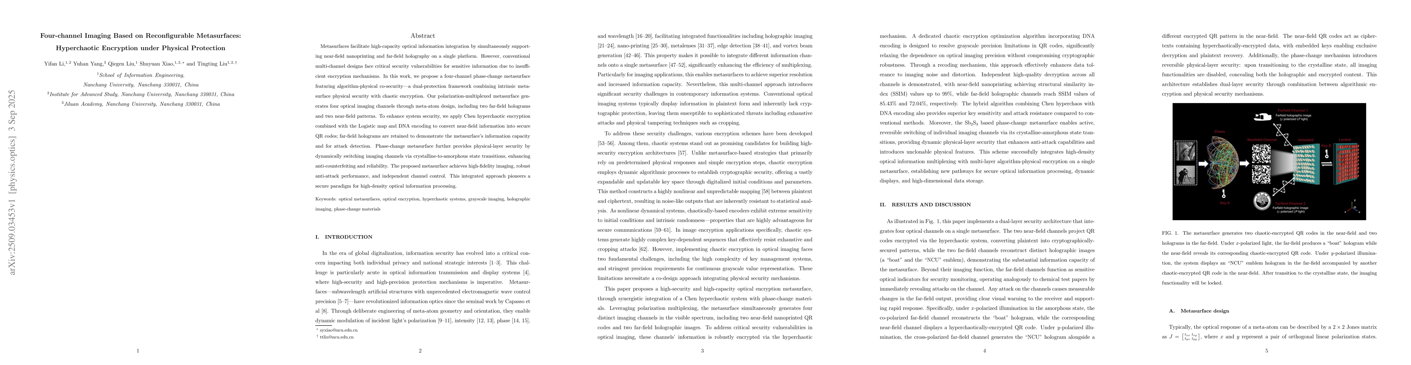 Metasurfaces facilitate high-capacity optical information integration by simultaneously supporting near-field nanoprinting and far-field holography on a single platform. However, conventional multi-channel designs face critical security vulnerabilities for sensitive information due to insufficient encryption mechanisms. In this work, we propose a four-channel phase-change metasurface featuring algorithm-physical co-security-a dual-protection framework combining intrinsic metasurface physical security with chaotic encryption. Our polarization-multiplexed metasurface generates four optical imaging channels through meta-atom design, including two far-field holograms and two near-field patterns. To enhance system security, we apply Chen hyperchaotic encryption combined with the Logistic map and DNA encoding to convert near-field information into secure QR codes; far-field holograms are retained to demonstrate the metasurface's information capacity and for attack detection. Phase-change metasurface further provides physical-layer security by dynamically switching imaging channels via crystalline-to-amorphous state transitions, enhancing anti-counterfeiting and reliability. The proposed metasurface achieves high-fidelity imaging, robust anti-attack performance, and independent channel control. This integrated approach pioneers a secure paradigm for high-density optical information processing.