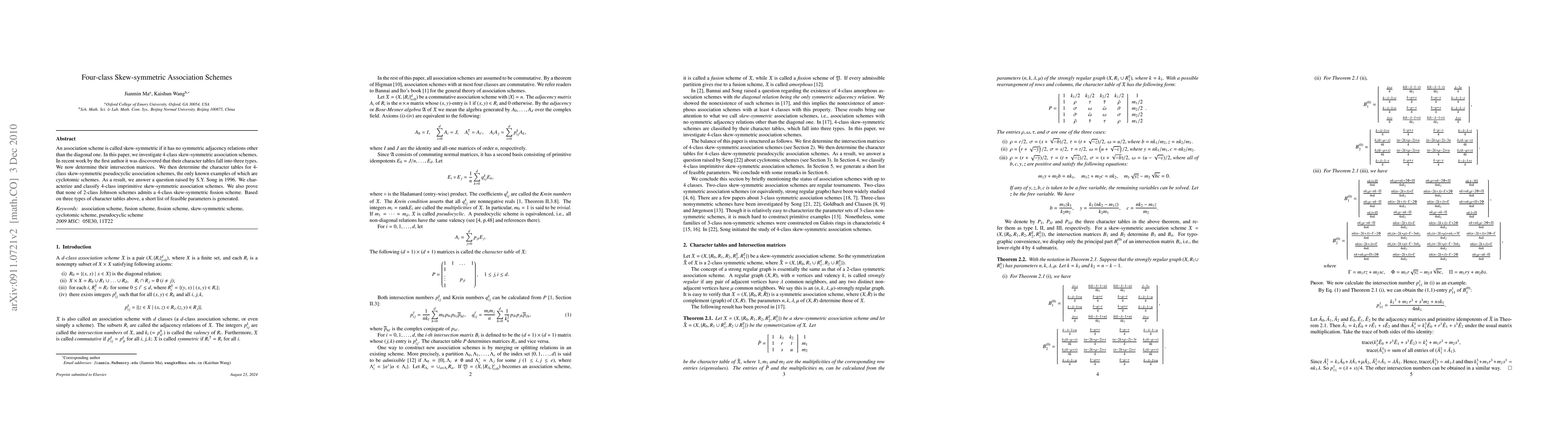 This paper investigates 4-class skew-symmetric association schemes, determining their intersection matrices, character tables, and intersection numbers for pseudocyclic schemes. It classifies these schemes and proves that no 2-class Johnson scheme can accommodate a 4-class skew-symmetric fission scheme, providing a concise list of feasible parameters based on identified character table types.