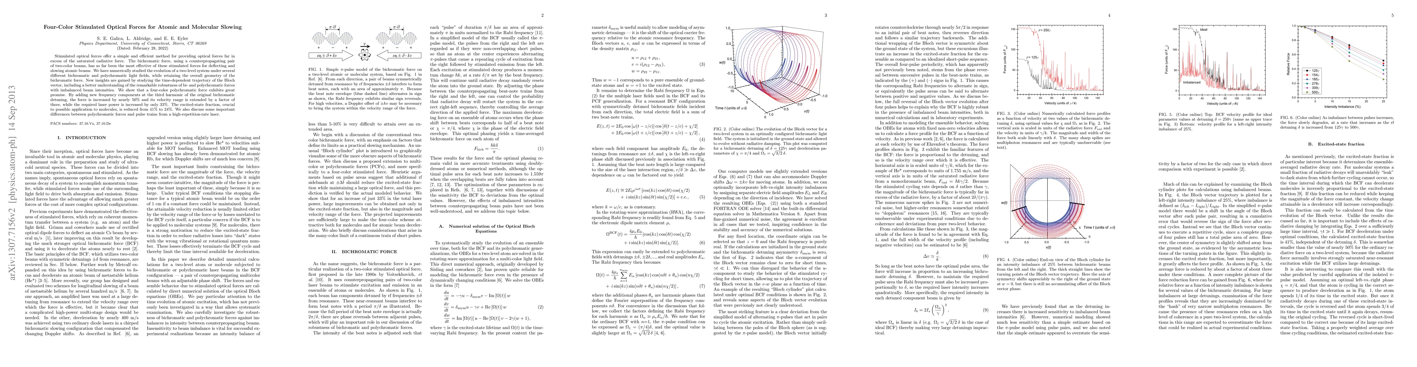 Stimulated optical forces offer a simple and efficient method for providing optical forces far in excess of the saturated radiative force. The bichromatic force, using a counterpropagating pair of two-color beams, has so far been the most effective of these stimulated forces for deflecting and slowing atomic beams. We have numerically studied the evolution of a two-level system under several different bichromatic and polychromatic light fields, while retaining the overall geometry of the bichromatic force. New insights are gained by studying the time-dependent trajectory of the Bloch vector, including a better understanding of the remarkable robustness of bi- and polychromatic forces with imbalanced beam intensities. We show that a four-color polychromatic force exhibits great promise. By adding new frequency components at the third harmonic of the original bichromatic detuning, the force is increased by nearly 50% and its velocity range is extended by a factor of three, while the required laser power is increased by only 33%. The excited-state fraction, crucial to possible application to molecules, is reduced from 41% to 24%. We also discuss some important differences between polychromatic forces and pulse trains from a high-repetition-rate laser.