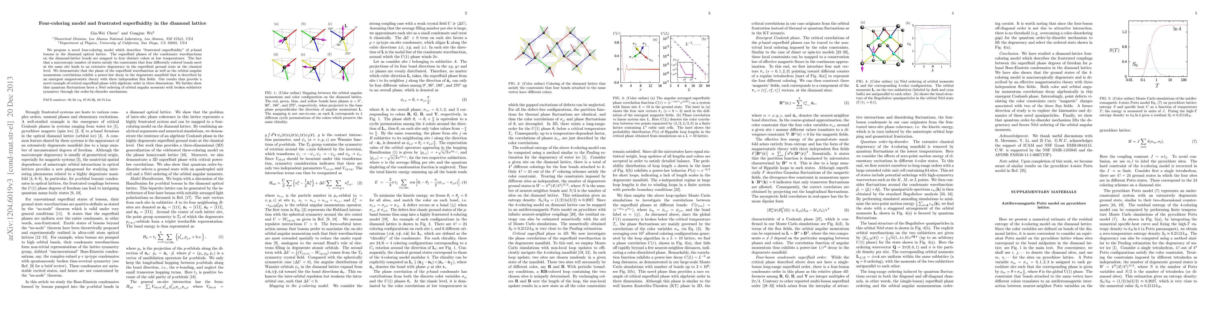 We propose a novel four-coloring model which describes "frustrated superfluidity" of $p$-band bosons in the diamond optical lattice. The superfluid phases of the condensate wavefunctions on the diamond-lattice bonds are mapped to four distinct colors at low temperatures. The fact that a macroscopic number of states satisfy the constraints that four differently colored bonds meet at the same site leads to an extensive degeneracy in the superfluid ground state at the classical level. We demonstrate that the phase of the superfluid wavefunction as well as the orbital angular momentum correlations exhibit a power-law decay in the degenerate manifold that is described by an emergent magnetostatic theory with three independent flux fields. Our results thus provide a novel example of critical superfluid phase with algebraic order in three dimensions. We further show that quantum fluctuations favor a N\'eel ordering of orbital angular moments with broken sublattice symmetry through the order-by-disorder mechanism.
