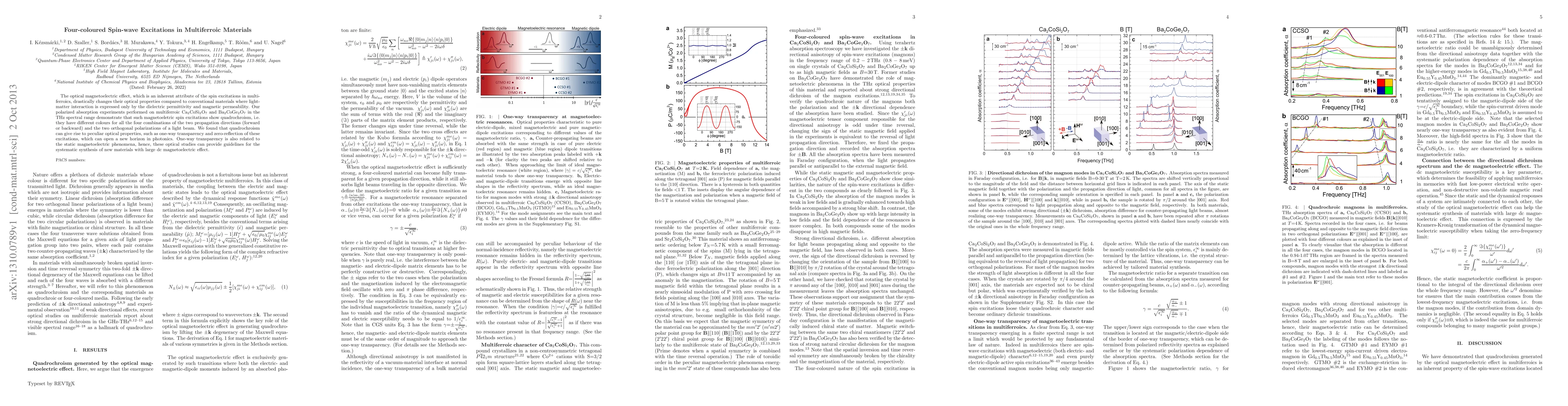 This study reveals that spin excitations in multiferroic materials like Ca2CoSi2O7 and Ba2CoGe2O7 exhibit four-coloured quadrochroism, leading to unique optical properties such as one-way transparency and zero-reflection. These findings suggest potential advancements in photonics and provide insights for developing new materials with significant static magnetoelectric effects.