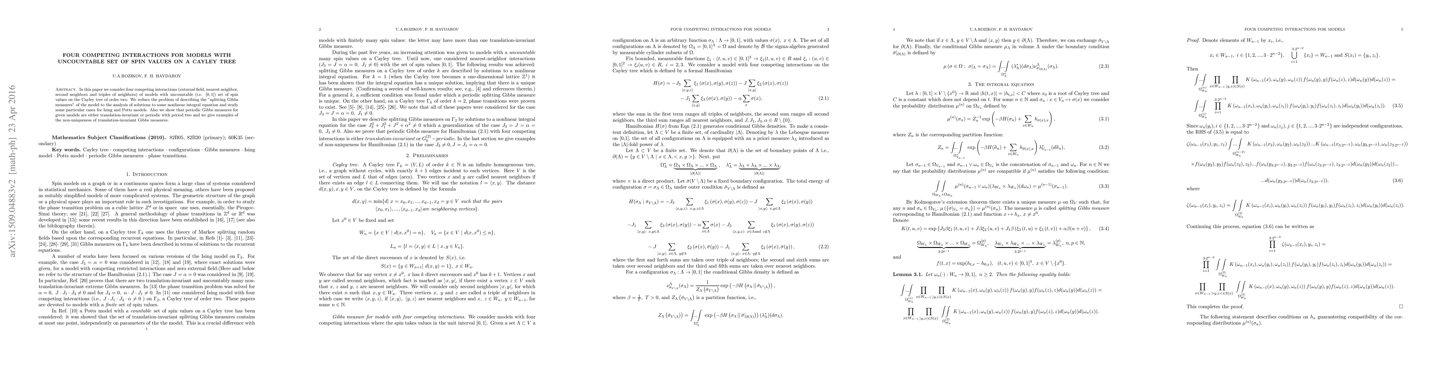 This paper investigates four competing interactions in models with an uncountable spin set on a Cayley tree, focusing on the "splitting Gibbs measures." It reduces the problem to analyzing solutions of a nonlinear integral equation and examines specific cases for Ising and Potts models, revealing the non-uniqueness of translation-invariant Gibbs measures.