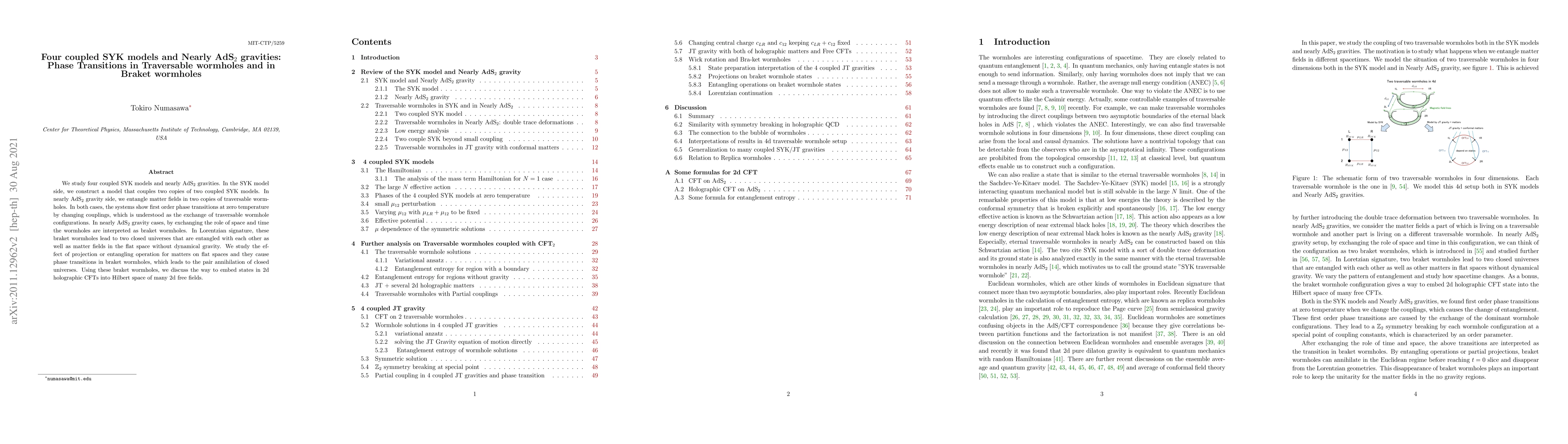 This paper investigates the phase transitions in four coupled SYK models and nearly AdS$_2$ gravities, revealing first order phase transitions at zero temperature due to the exchange of traversable wormholes. The study also explores the concept of bra-ket wormholes in nearly AdS$_2$ gravity, leading to entangled closed universes and their annihilation via projection or entangling operations.