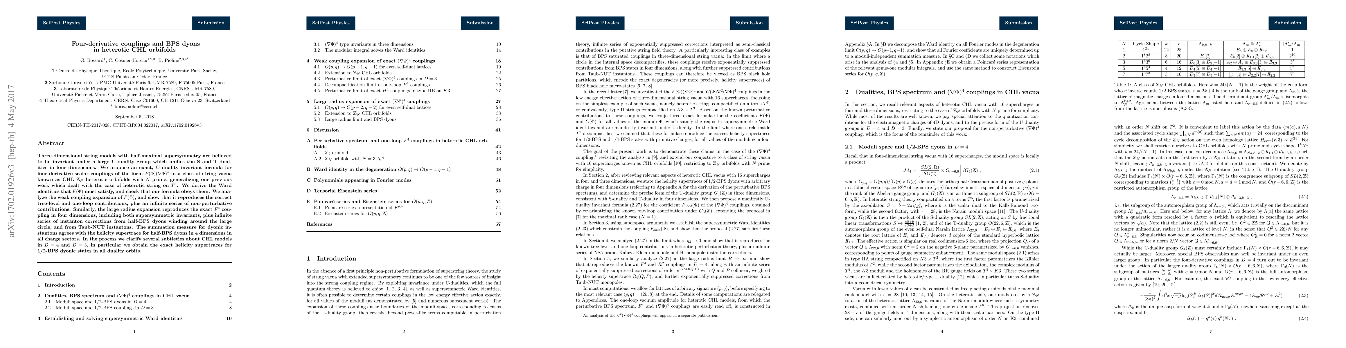 Three-dimensional string models with half-maximal supersymmetry are believed to be invariant under a large U-duality group which unifies the S and T dualities in four dimensions. We propose an exact, U-duality invariant formula for four-derivative scalar couplings of the form $F(\Phi) (\nabla\Phi)^4$ in a class of string vacua known as CHL $\mathbb{Z}_N$ heterotic orbifolds with $N$ prime, generalizing our previous work which dealt with the case of heterotic string on $T^6$. We derive the Ward identities that $F(\Phi)$ must satisfy, and check that our formula obeys them. We analyze the weak coupling expansion of $F(\Phi)$, and show that it reproduces the correct tree-level and one-loop contributions, plus an infinite series of non-perturbative contributions. Similarly, the large radius expansion reproduces the exact $F^4$ coupling in four dimensions, including both supersymmetric invariants, plus infinite series of instanton corrections from half-BPS dyons winding around the large circle, and from Taub-NUT instantons. The summation measure for dyonic instantons agrees with the helicity supertrace for half-BPS dyons in 4 dimensions in all charge sectors. In the process we clarify several subtleties about CHL models in $D=4$ and $D=3$, in particular we obtain the exact helicity supertraces for 1/2-BPS dyonic states in all duality orbits.