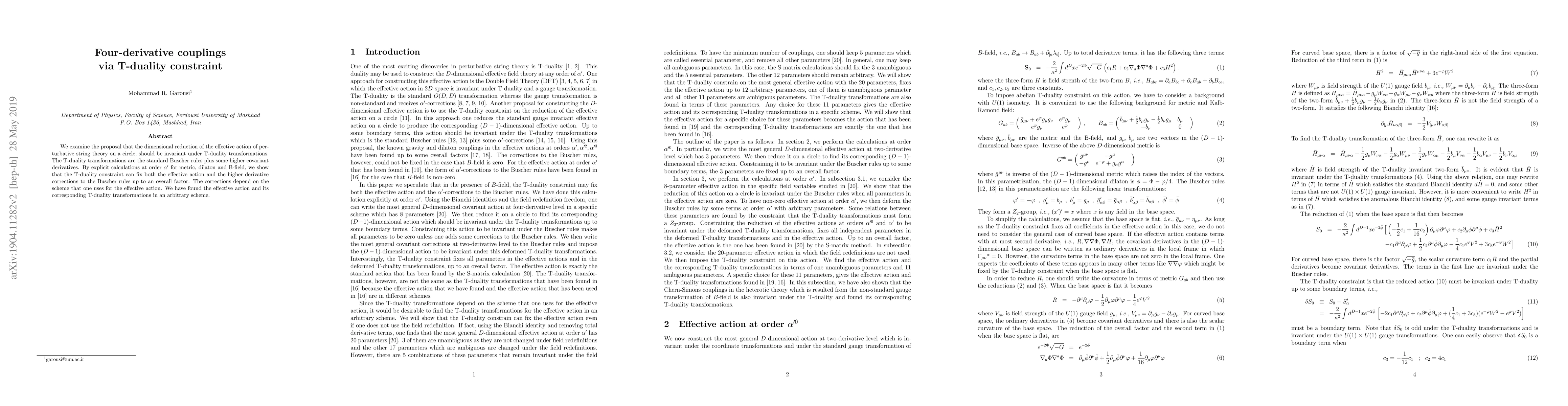 The paper presents a detailed analysis of four-derivative couplings in the context of T-duality, fixing the effective action and its corrections up to an overall factor, and demonstrating the necessity of higher-derivative corrections to the Buscher rules.