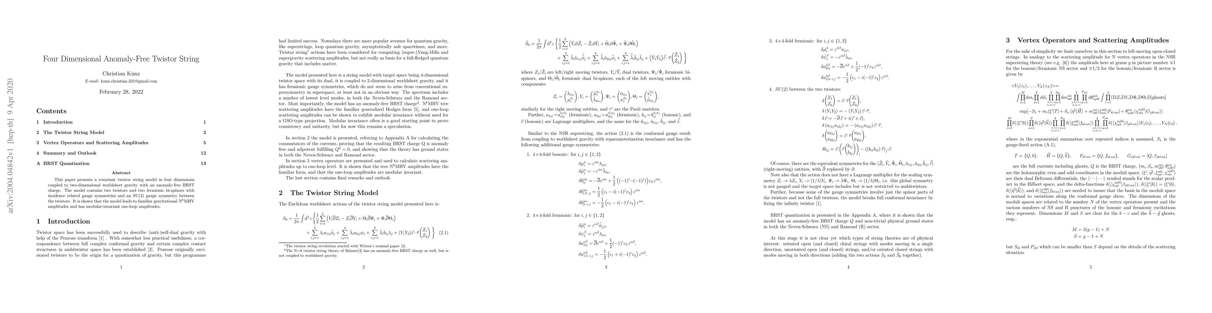 This paper presents a covariant twistor string model in four dimensions coupled to two-dimensional worldsheet gravity with an anomaly-free BRST charge. The model contains two twistors and two fermionic bi-spinors with incidence related gauge symmetries and an SU(2) gauge symmetry between the twistors. It is shown that the model leads to familiar gravitational N$^k$MHV amplitudes and has modular-invariant one-loop amplitudes.