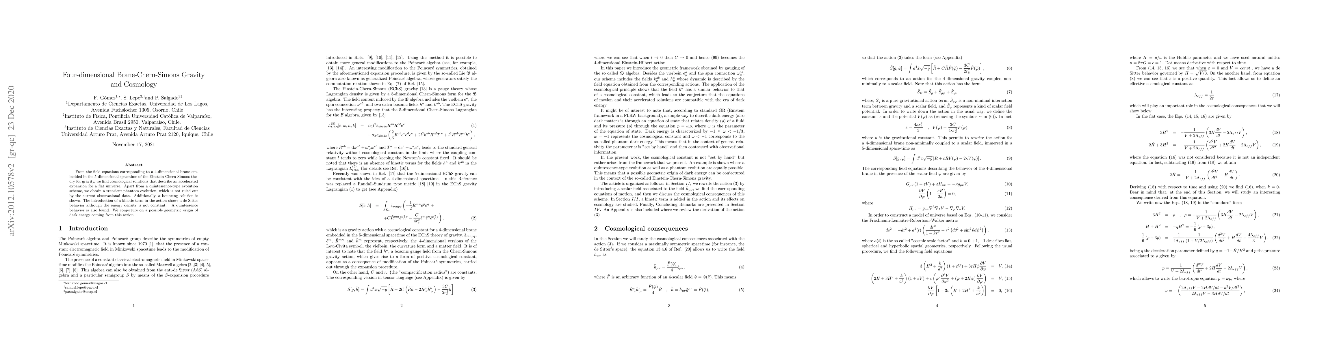 This paper explores cosmological solutions from 4-dimensional brane-Chern-Simons gravity, revealing accelerated expansion, transient phantom evolution, and a bouncing solution in a flat universe. It also discusses a de Sitter behavior and quintessence, suggesting a geometric origin for dark energy.